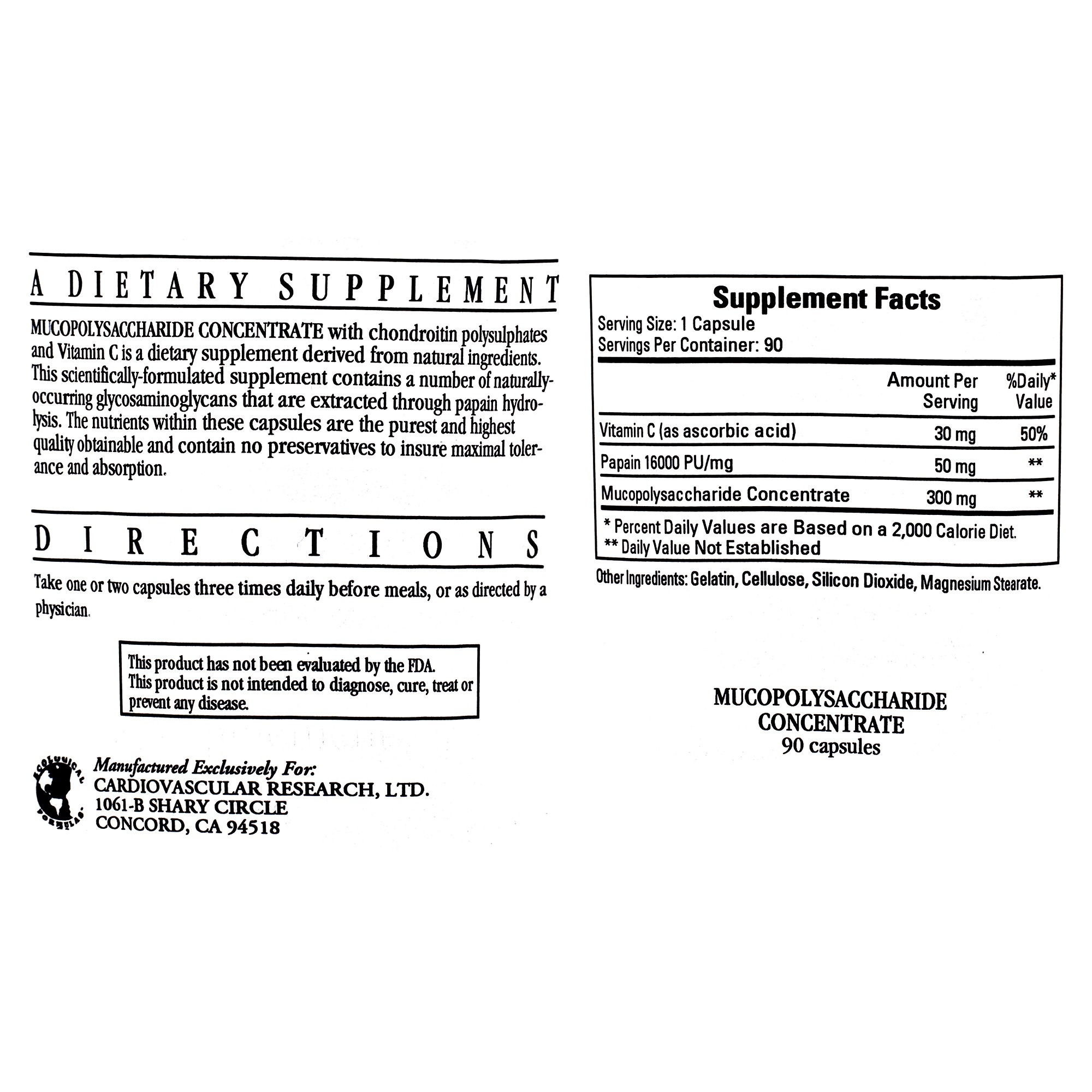 Mucopolysaccharide Concentrate with chondroitin polysulphates and Vitamin C is a nutritional supplement derived from natural ingredients. This scientifically formulated supplement contains a number of naturally occurring glycosaminoglycans that are extracted through papain hydrolysis. The nutrients within these capsules are the purest and highest quality obtainable and contain no preservatives to insure maximal tolerance and absorption.