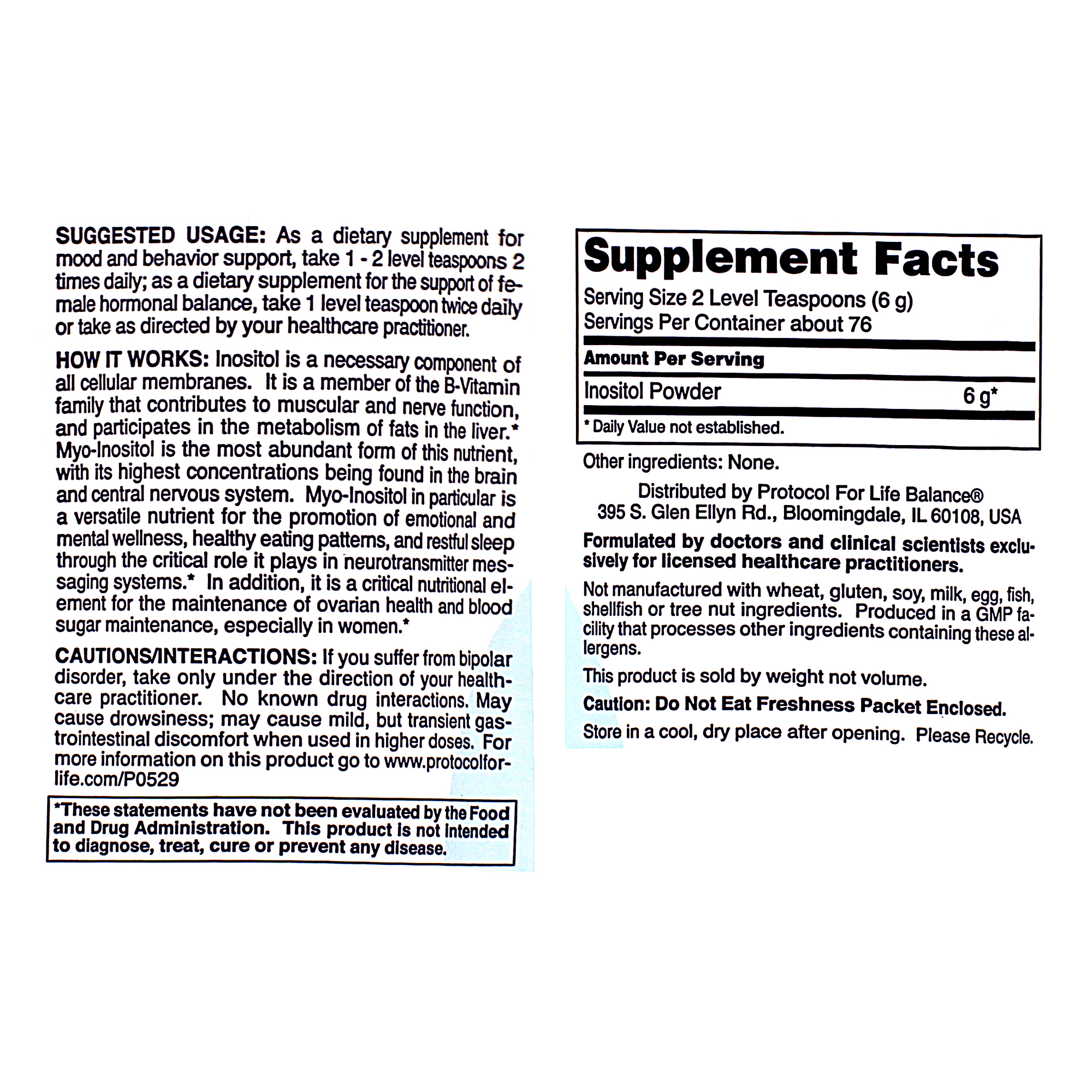 Inositol is a necessary component of all cellular membranes.* It is a member of the B-Vitamin family that contributes to muscular and nerve function, and participates in the metabolism of fats in the liver.* Myo-Inositol is the most abundant form of this nutrient, with its highest concentrations being found in the brain and central nervous system.* Myo-Inositol in particular is a versatile nutrient for the promotion of emotional and mental wellness, healthy eating patterns, and restful sleep through its critical role in neurotransmitter messaging systems.* In addition, it is an important nutritional element for the maintenance of ovarian health and normal blood sugar maintenance, especially in women.*
