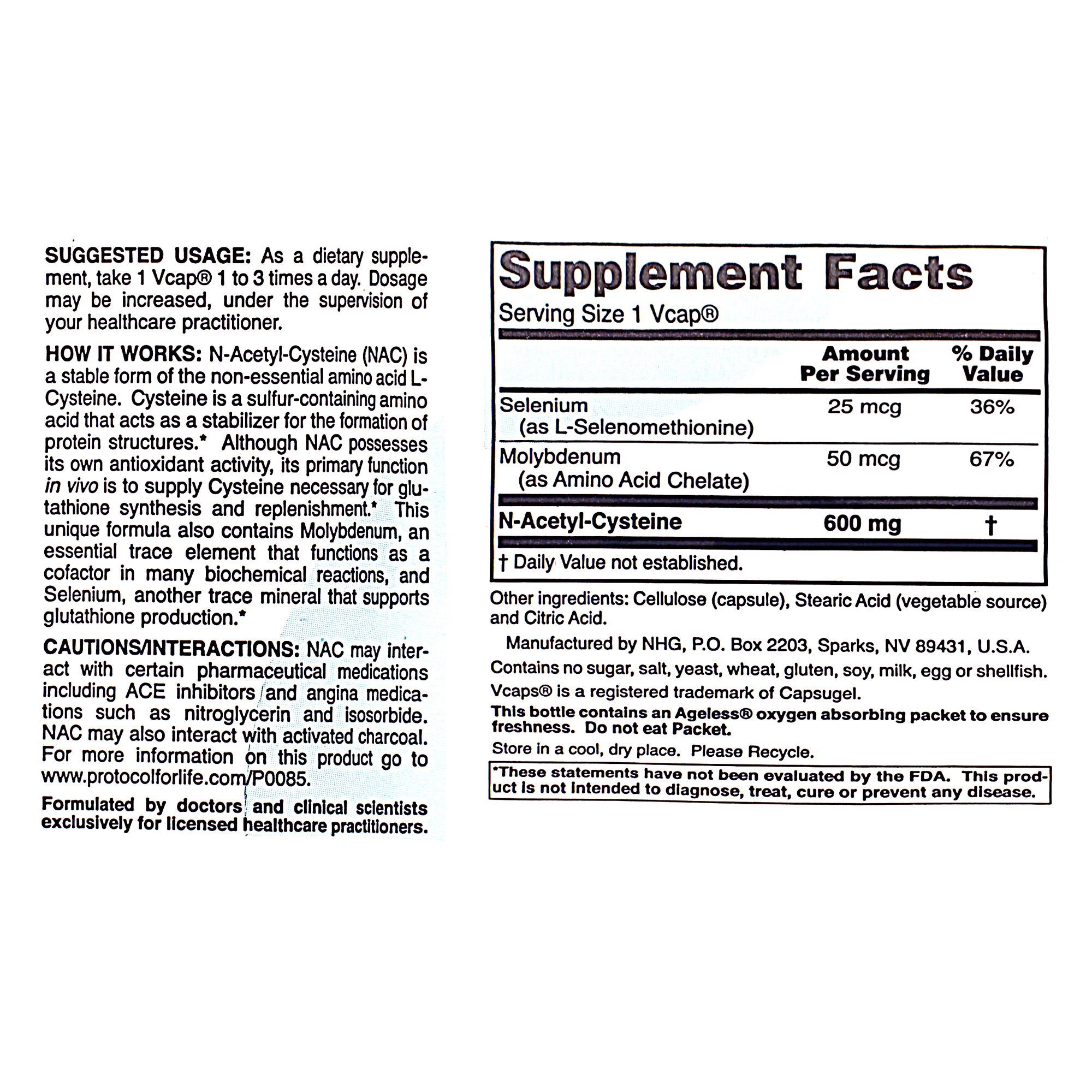 N-Acetyl-Cysteine (NAC) is a stable form of the non-essential amino acid L-Cysteine. Cysteine is a sulfur-containing amino acid that acts as a stabilizer for the formation of protein structures.* Although NAC possesses its own free radical scavenging activity, its primary function in the body is to supply Cysteine necessary for glutathione synthesis and replenishment.* This unique formula also contains Molybdenum, an essential trace element that functions as a cofactor in many biochemical reactions, and Selenium, another trace mineral that supports glutathione production.*