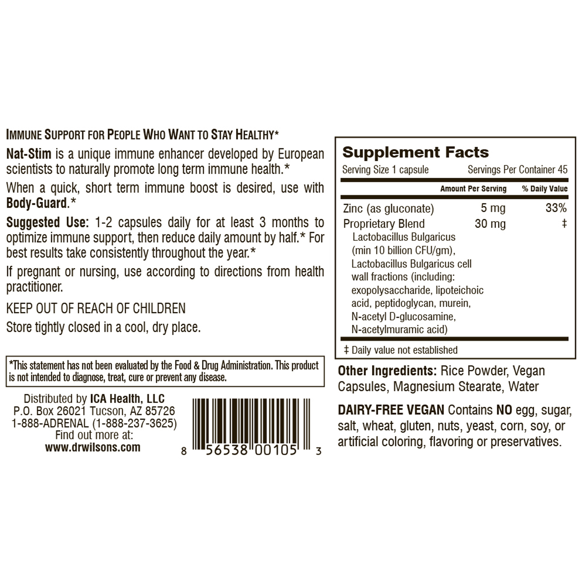 Take 1 capsule with water 1-2 times a day. If swallowing capsules is difficult, open the capsules and mix the mild tasting contents into any beverage or soft food, or use Super Immune Space Sprinkles instead. Take daily for at least three months to optimize immune support.* After three months, most people can usually switch to half the daily amount and still maintain optimal immune enhancement.* For best results, take consistently throughout the year.* During times when extra immune support is desired, an additional capsule of Nat-Stim may be taken 1-2 times a day.* Body-Guard may also be taken temporarily with Nat-Stim at these times for a quick, extra immune boost.*