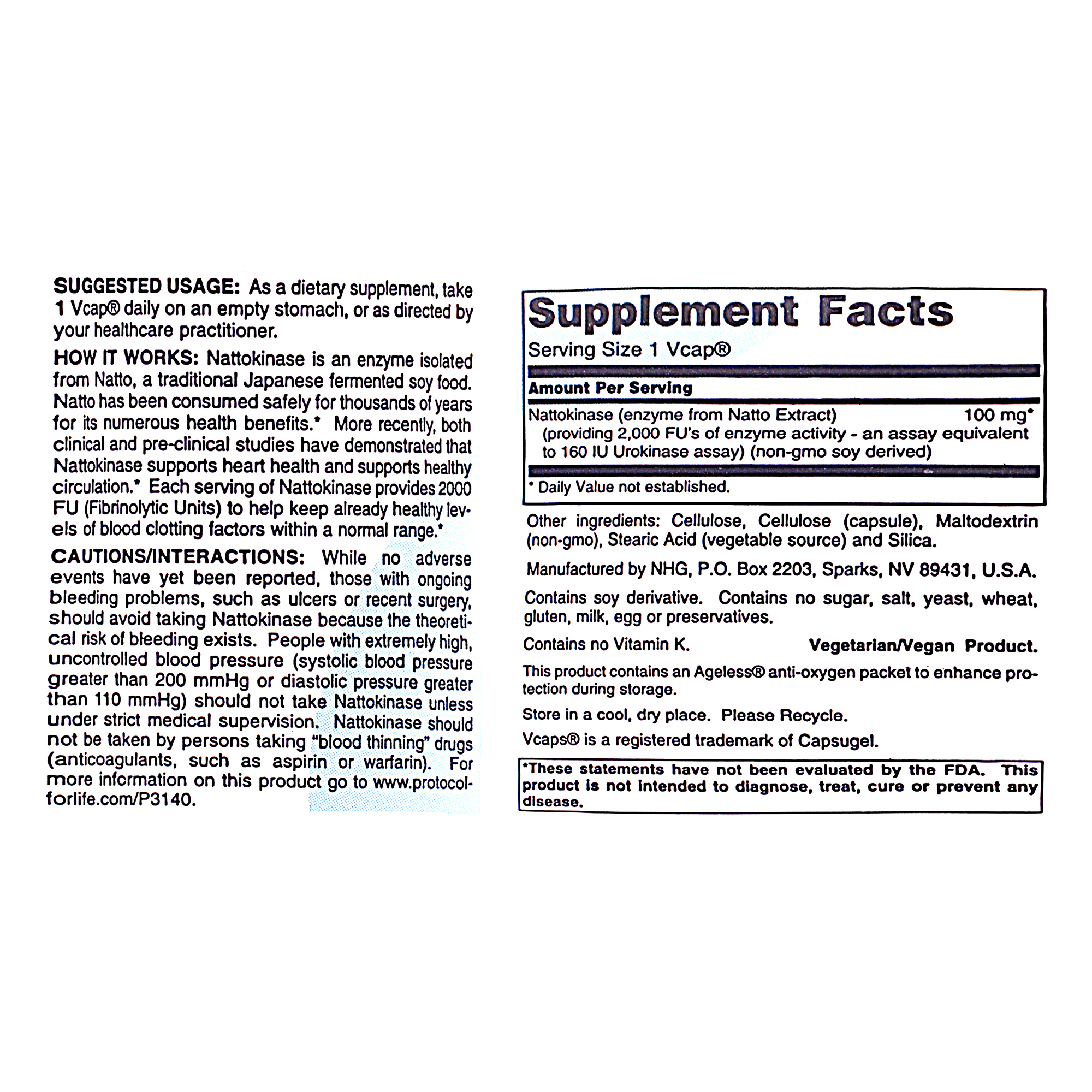 Nattokinase is an enzyme isolated from Natto, a traditional Japanese fermented soy food that has been consumed for thousands of years for its numerous health promoting properties.* More recently, both clinical and non-clinical studies have demonstrated that Nattokinase can promote heart and circulatory health by helping to maintain normal blood fluidity.* Each serving of Protocol For Life Balance® Non-GMO Nattokinase has 2, 000 FU (Fibrinolytic Units) for the maintenance of proper blood flow.*