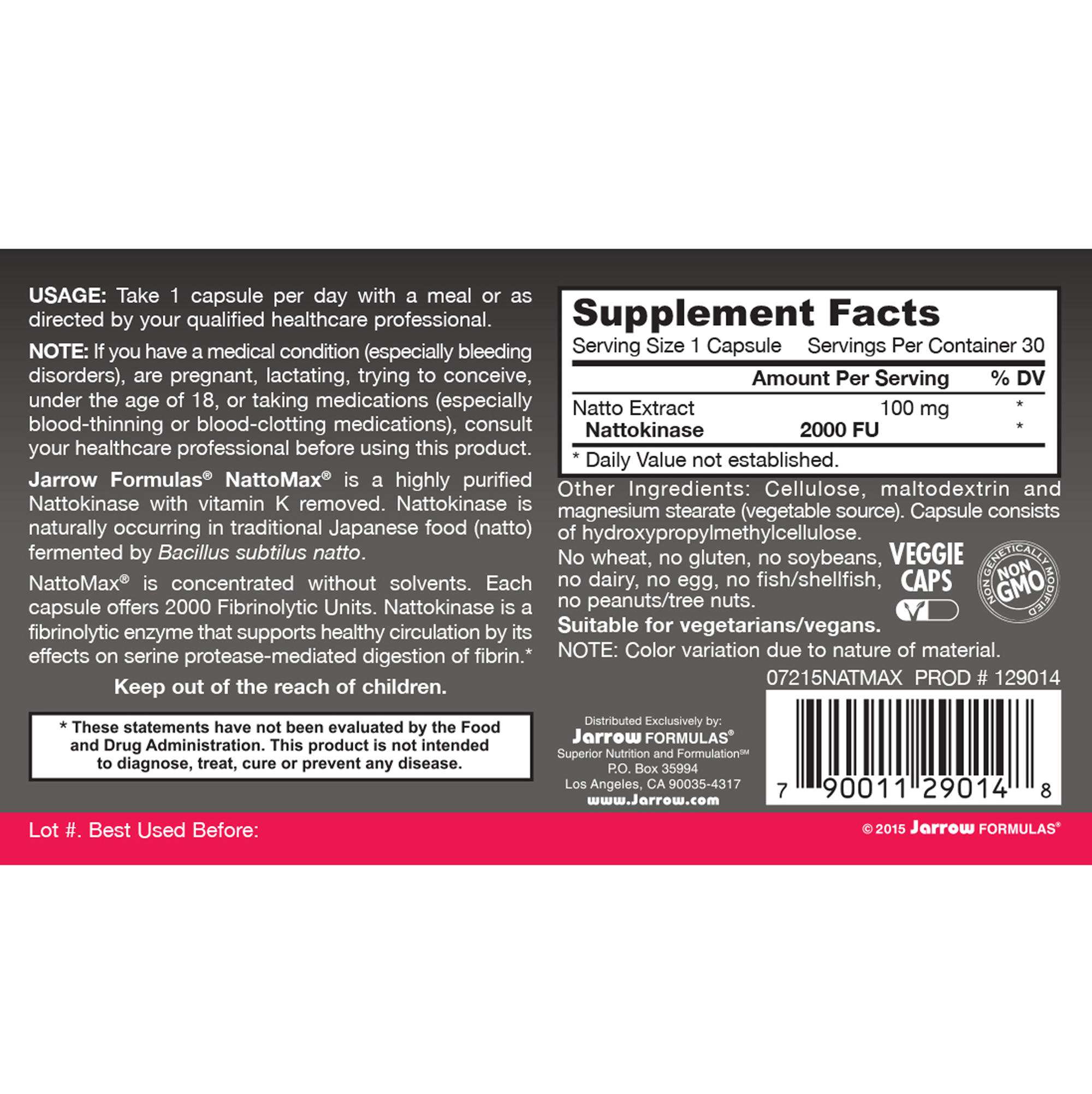 Jarrow Formulas® NattoMax® is a highly purified Nattokinase with vitamin K removed. Nattokinase is naturally occurring in traditional Japanese food (natto) fermented by Bacillus subtilus natto.