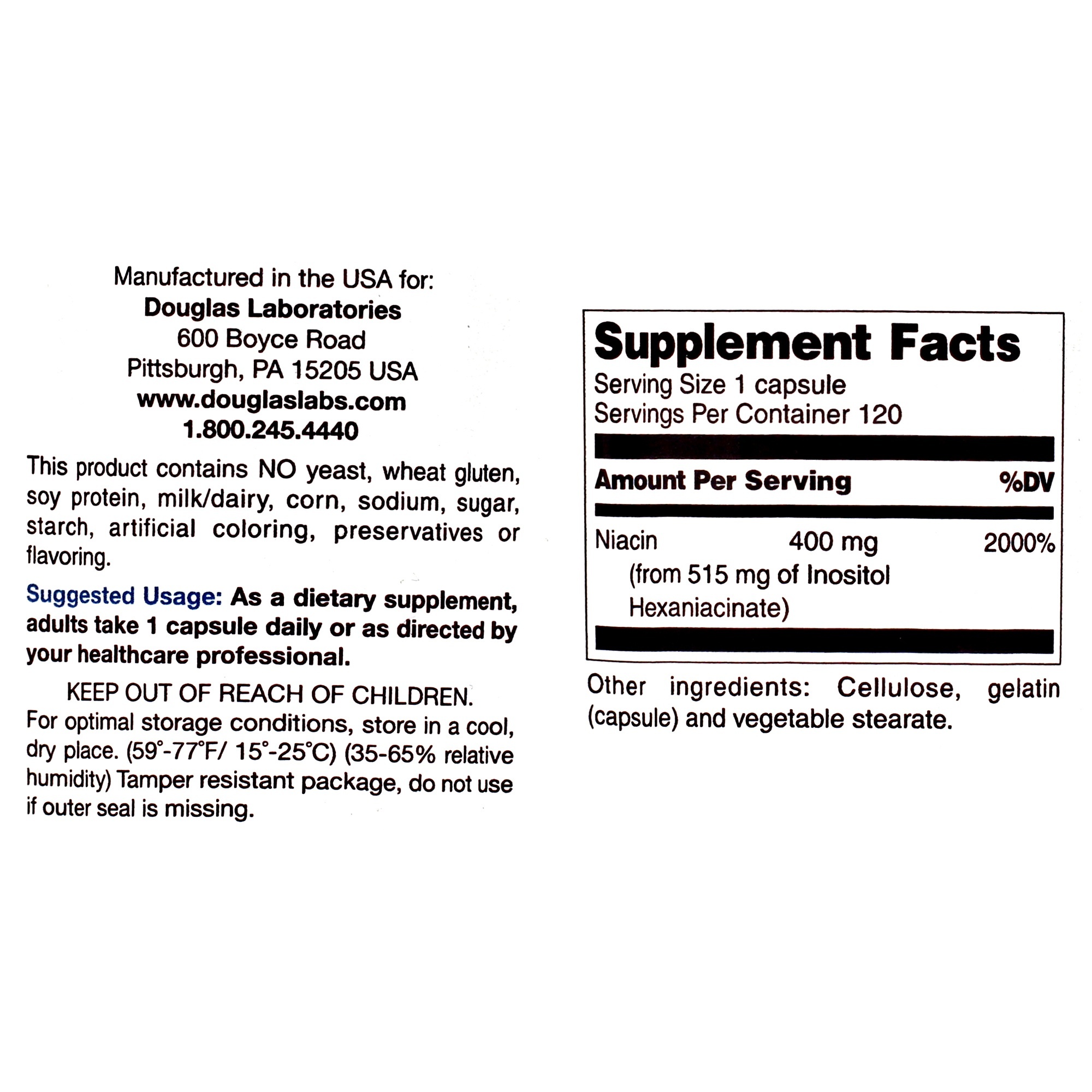 Niacinate-400, provided by Douglas Laboratories, contains 400 mg of niacin from 515 mg of inositol hexaniacinate in capsule form.