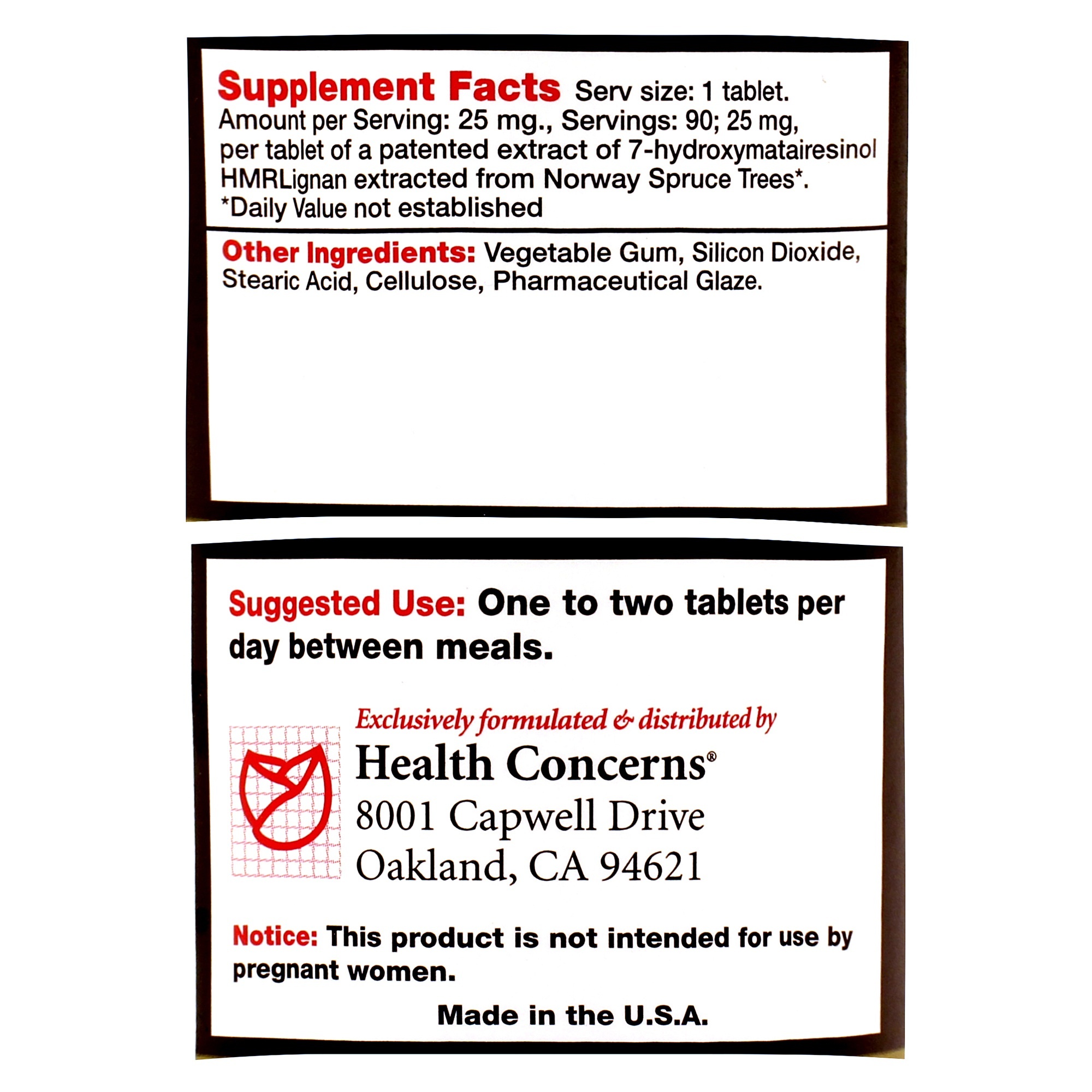 Servings: 90; 25mg, per tablet of a patented extract of 7-hydroxymatairesinol HMRLignan extractd from Norway Spruce Trees.