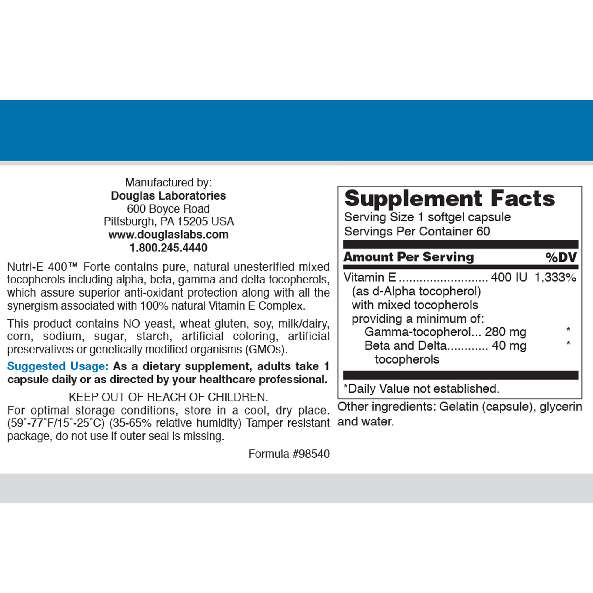 Nutri E-400 Forte by Douglas Laboratories contains 400 I.U. of 100% natural, unesterified vitamin E (dalpha-tocopherol), as well as a guaranteed minimum of the d-beta, d-gamma and d-delta tocopherols, which is unique among most mixed tocopherol products available. No synthetic vitamin E is used.