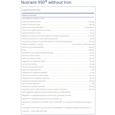 Nutrient 950 without Iron is a hypoallergenic multivitamin and mineral dietary supplement formulated to provide optimal nutritional support. Nutrient 950 without Iron offers an advanced mineral delivery system to promote proper absorption of nutrients.*