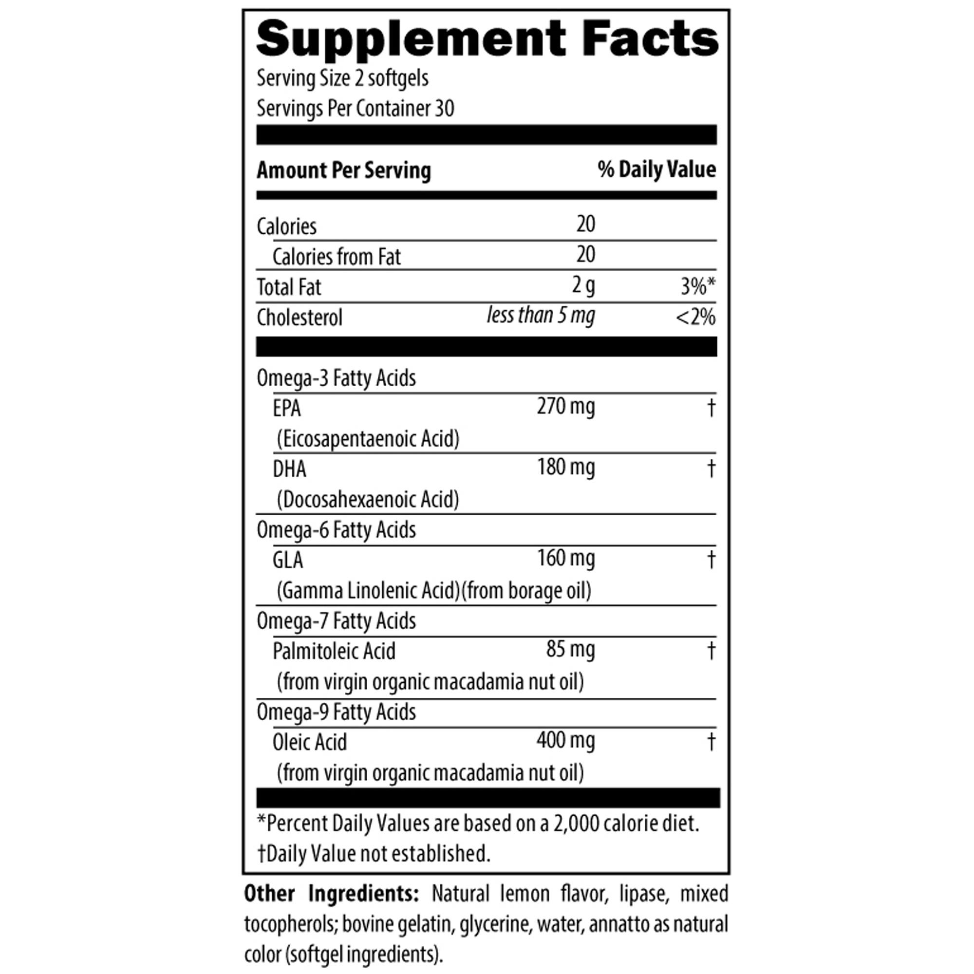 This unique omega 3-6-7-9 formula contains a blend of wild deep-sea sourced fish oils containing the omega-3 fats (EPA/DHA) in the TruTG™ form, the most important omega-6 fat (GLA from borage oil), the omega-7 fat palmitoleic acid and omega-9 fat oleic acid from certified virgin organic macadamia nut oil. EPA helps keep GLA metabolism in an anti-inflammatory mode. In addition, docosahexaenoic acid (DHA) plays as many important roles in human health as EPA, along with promoting brain wellness.