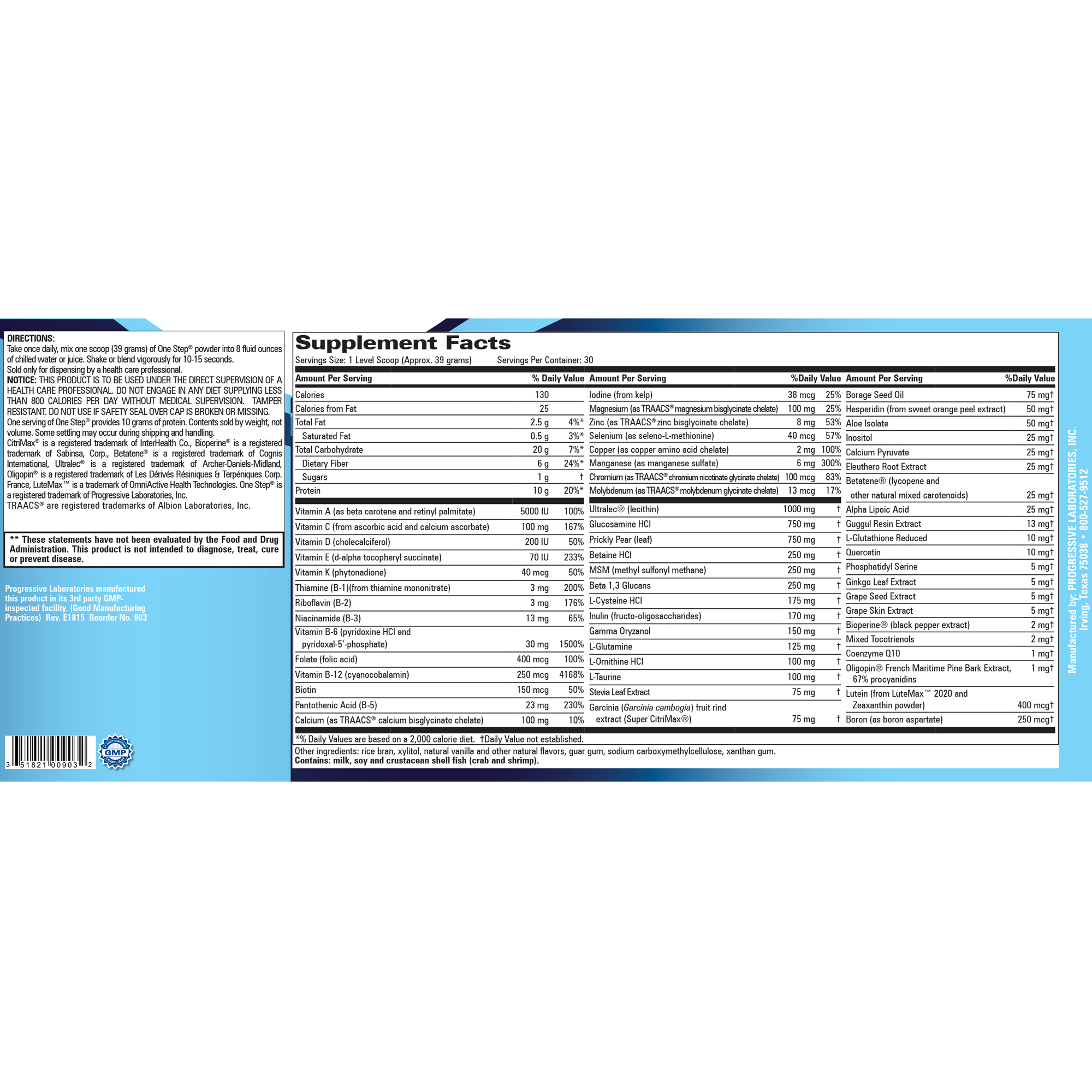 Twice daily, once in the morning and once in the afternoon, blend, shake or briskly stir 1 level scoop (approx. 40 grams) of One Step powder into 8 fluid ounces of chilled water or juice.
