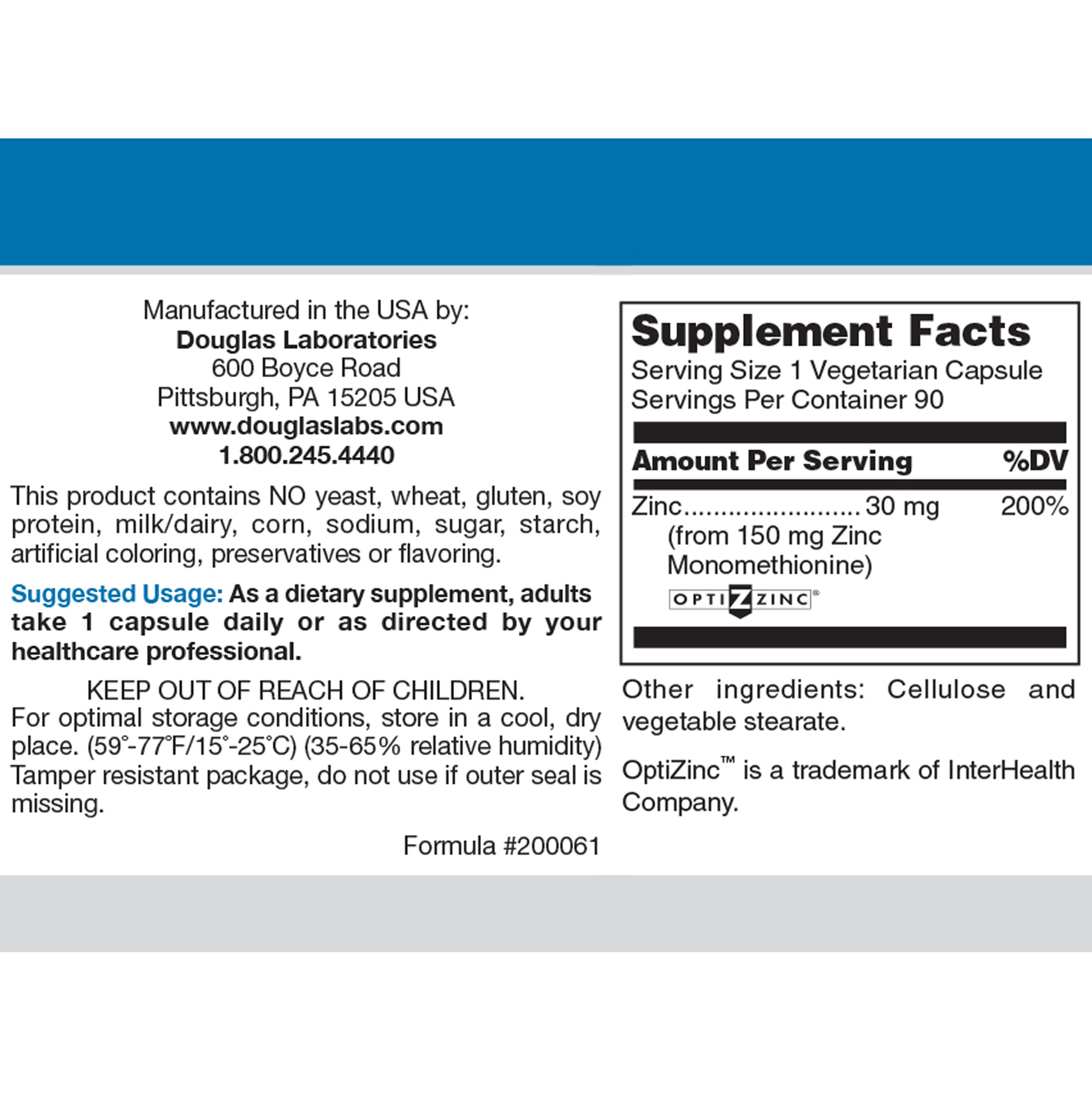 Opti-Zinc™vegetarian capsules supply elemental zinc monomethionine, a chemically defined, patented organic compound which provides zinc and the amino acid methionine in a 1:1 ratio.