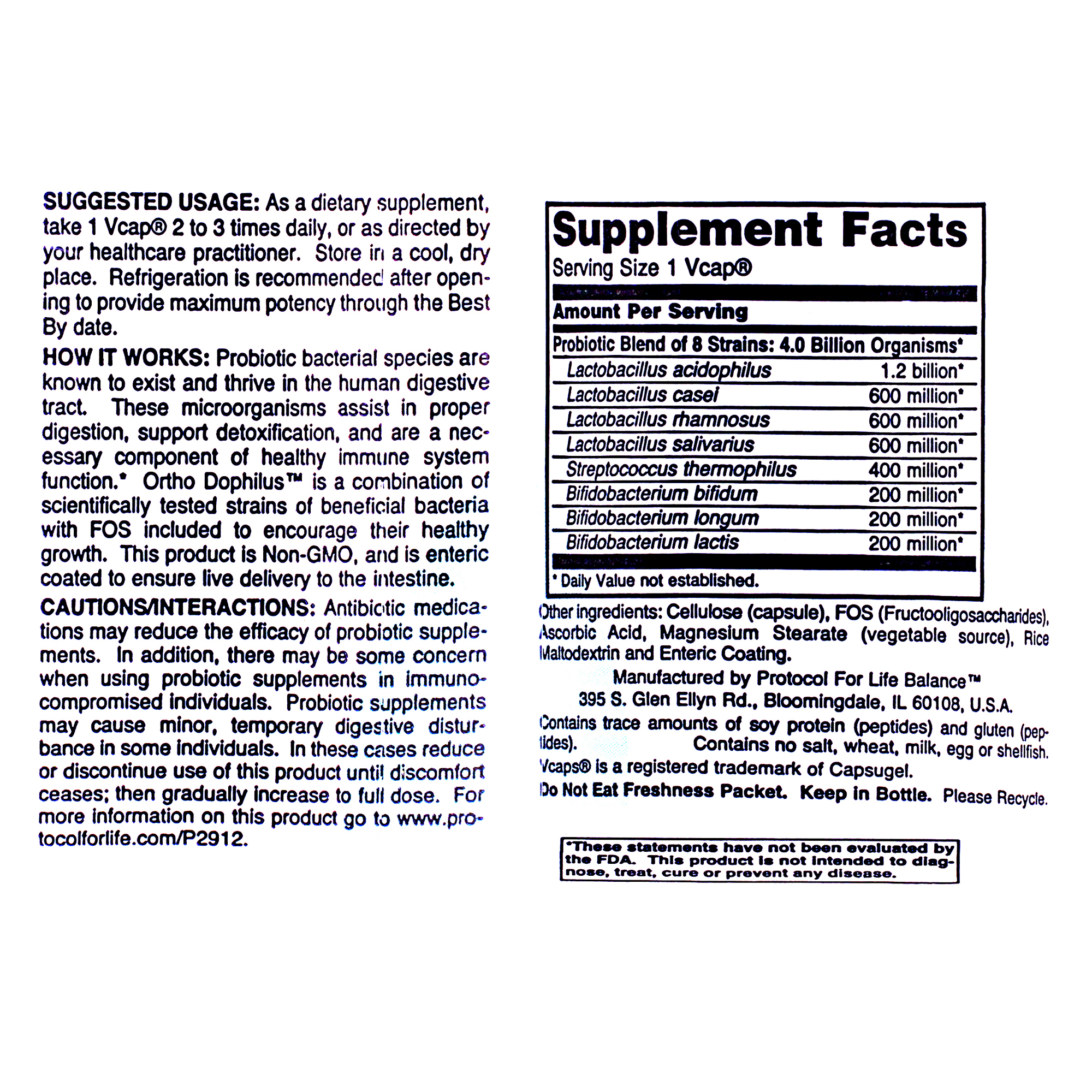 Other Ingredients: Cellulose (capsule), FOS (Fructooligosaccharides), Ascorbic Acid, Magnesium Stearate (vegetable source) and Enteric Coating.