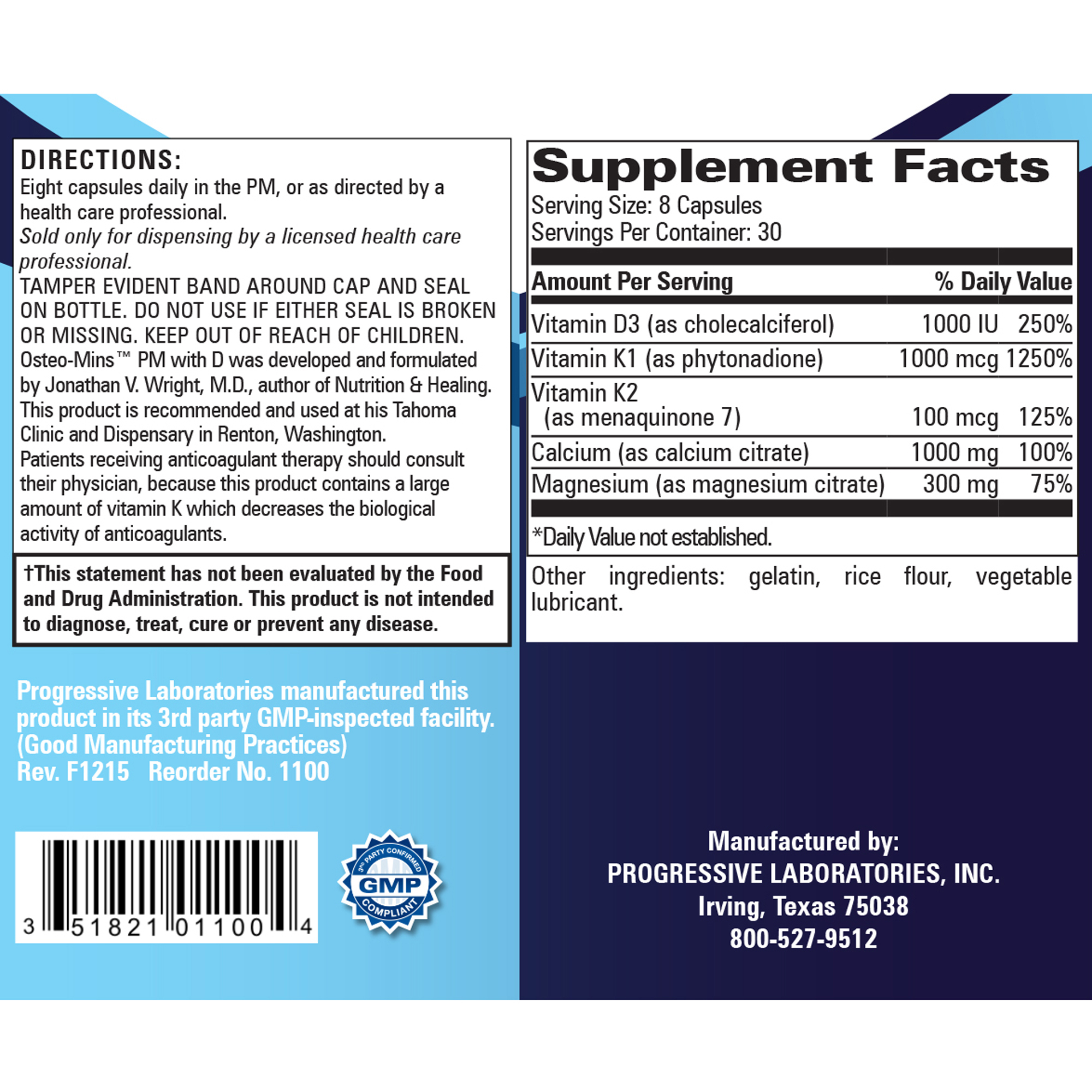 Osteo-Mins PM with D+K1, K2 uses both vitamin K1 and K2. Vitamin K is necessary for the synthesis of osteocalcin, the protein in bone tissue upon which calcium crystallizes. However, patients taking medications to prevent blood clotting must carefully monitor their intake of vitamin K. Bioavailable calcium is essential for bone health; however, bone is complex living tissue that, like other body tissues, has a wide range of nutritional needs. The Osteo-Mins formulas were developed and formulated by Jonathan V. Wright, M.D., author of Nutrition and Healing. In addition to calcium these formulas supply strontium, boron, silicon and other vitamins and trace minerals proven by research to support bone growth. The Osteo-Mins AM formula containing strontium, zinc, selenium, copper, manganese, molybdenum, boron and silicon is taken in the morning. The Osteo-Mins PM formula containing calcium, magnesium, vitamin D (or vitamins D and K) are taken at bedtime.