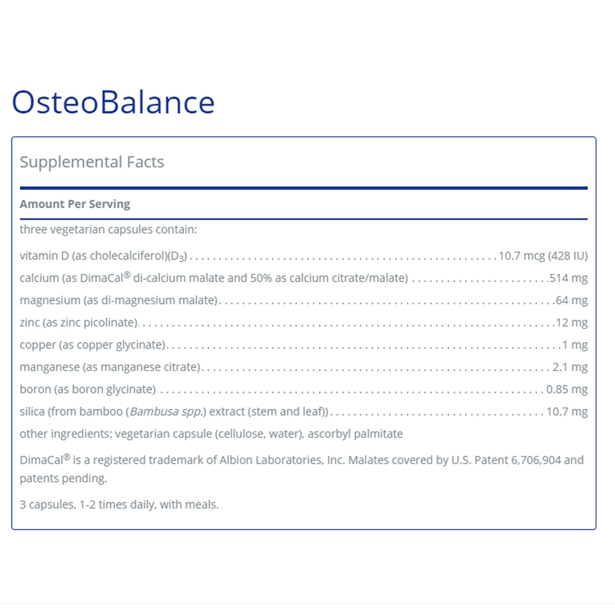 OsteoBalance provides 514 mg of calcium per serving from calcium citrate/malate and calcium malate. This formula also includes a comprehensive profile of important bone building nutrients. Calcium citrate/malate has excellent bioavailability and provided bone mass support for postmenopausal women with low dietary calcium intake in a two-year, double-blind placebo-controlled trial. One study indicated that concomitant supplementation of the trace minerals zinc, copper, and manganese with calcium citrate/malate helped to promote healthy bone metabolism in postmenopausal subjects. Magnesium supports healthy bone mineral density and boron plays an important role in reducing urinary calcium and magnesium excretion. Like boron, vitamin D3 reduces urinary calcium loss but is also a key nutrient because it enhances calcium absorption.*