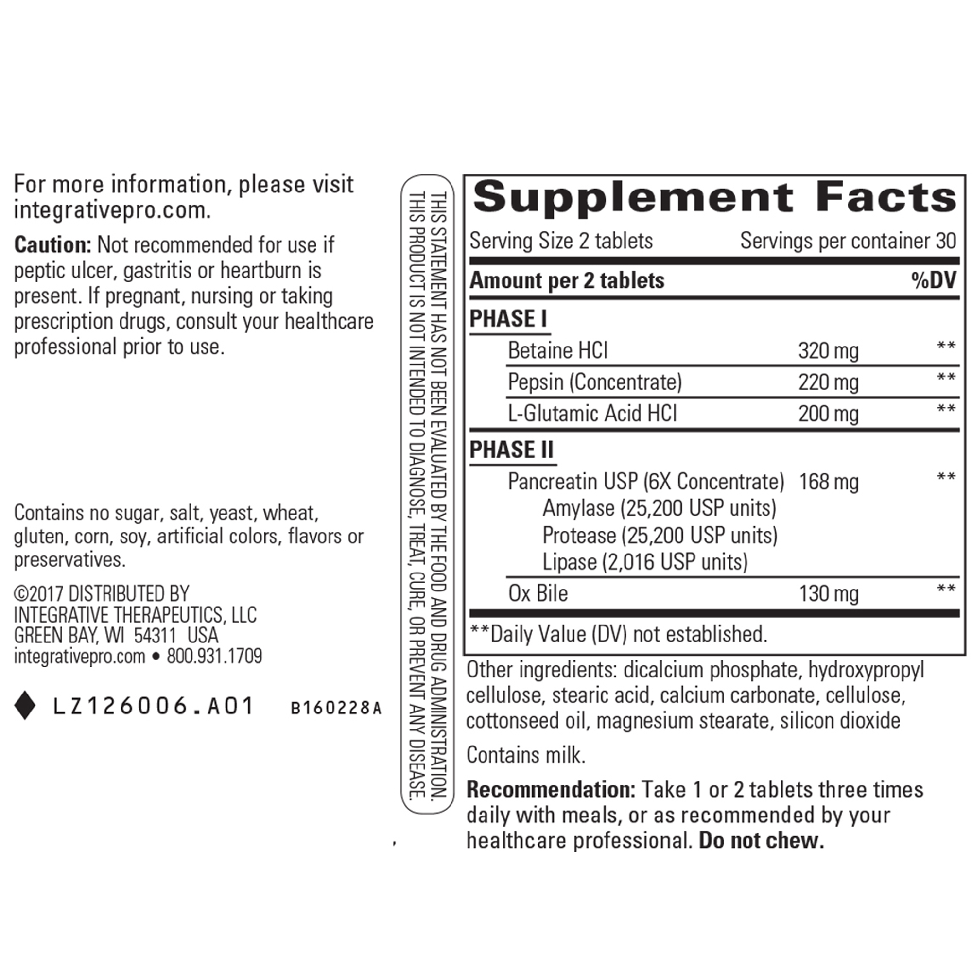 Panplex 2-Phase combines pancreatic enzymes with hydrochloric acid and pepsin for healthy digestion support.* Phase I gastric support includes hydrochloric acid and pepsin.* Phase II intestinal support includes pancreatin and bile salts which helps protect against deactivation of enzymes by stomach acids.*