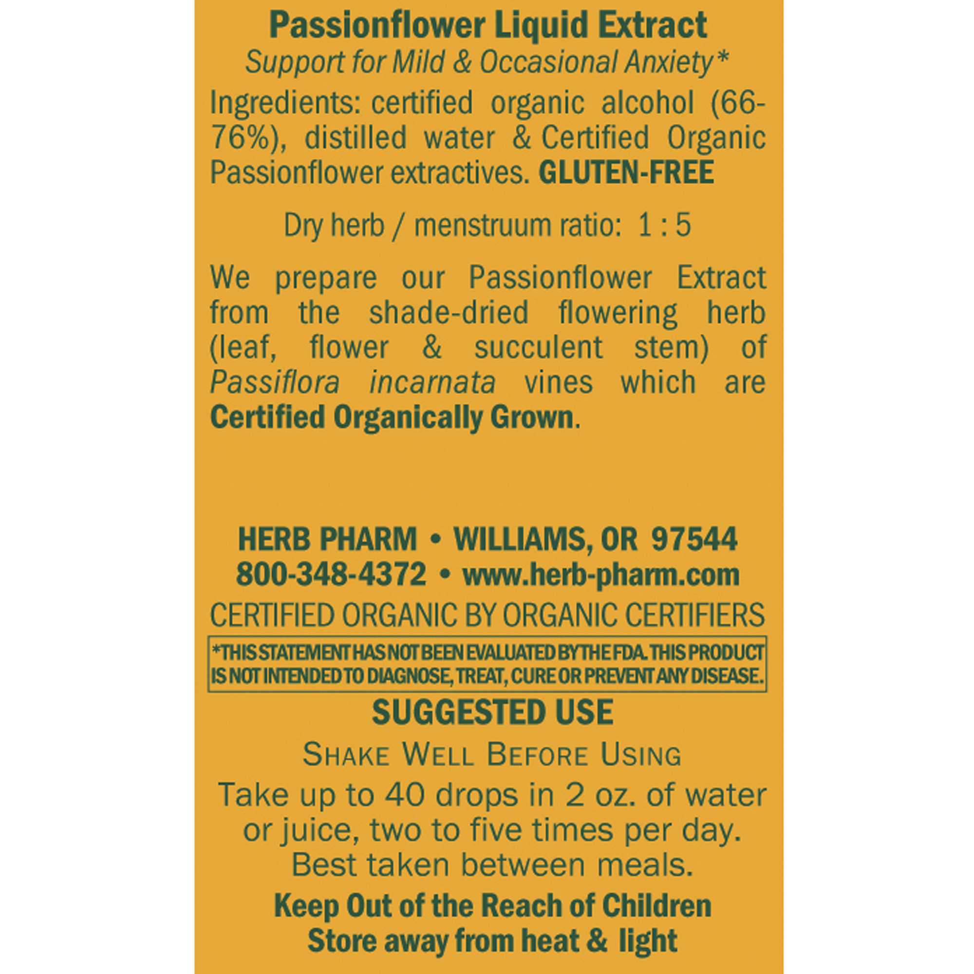 Herb Pharm prepares their Passionflower Extract from the flowering herb (leaf, flower and succulent stem) of Passiflora incarnata vines which are Certified Organically Grown.