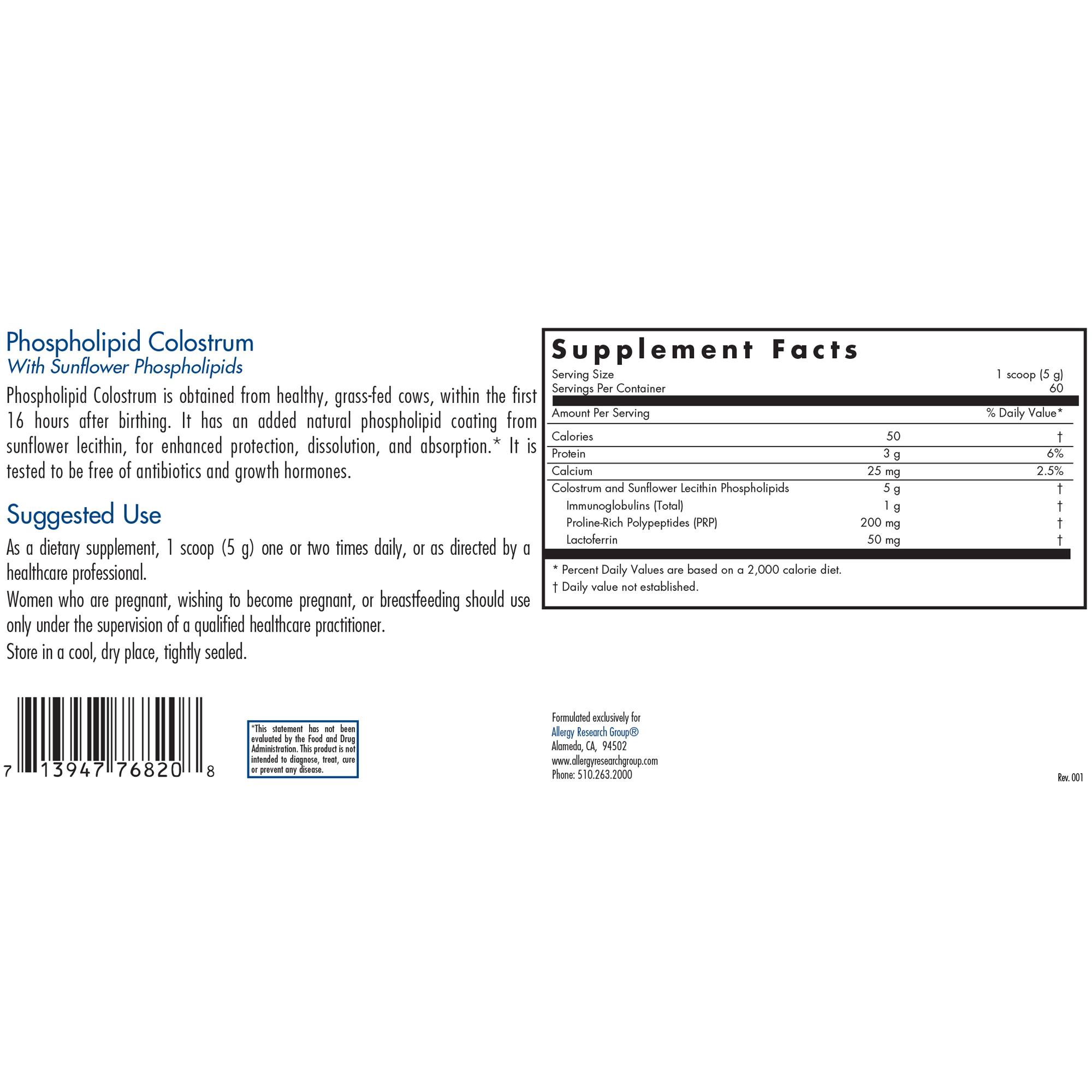 Phospholipid Colostrum is obtained from healthy, grass-fed cows, within the first 16 hours after birthing. It has an added natural phospholipid coating from sunflower lecithin, for enhanced protection, dissolution, and absorption.* It is tested to be free of antibiotics and growth hormones.