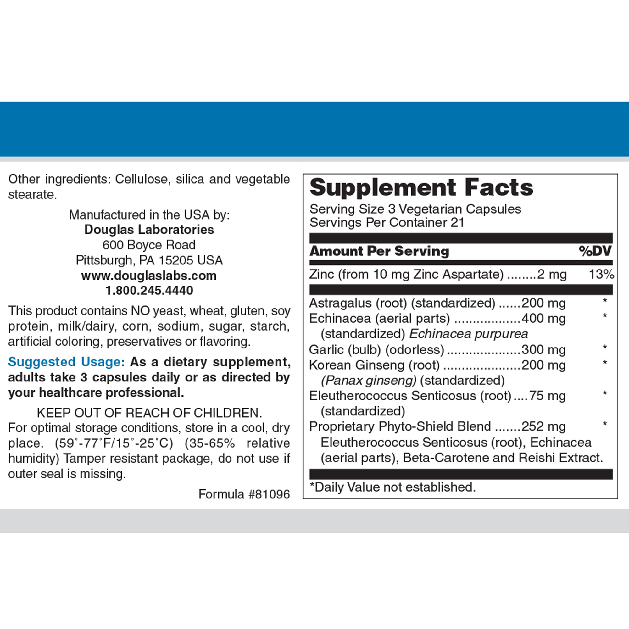 Phyto-Shield, provided by Douglas Laboratories, contains significant amounts of several key nutrients including echinacea and zinc, specially formulated to aid in immune support.