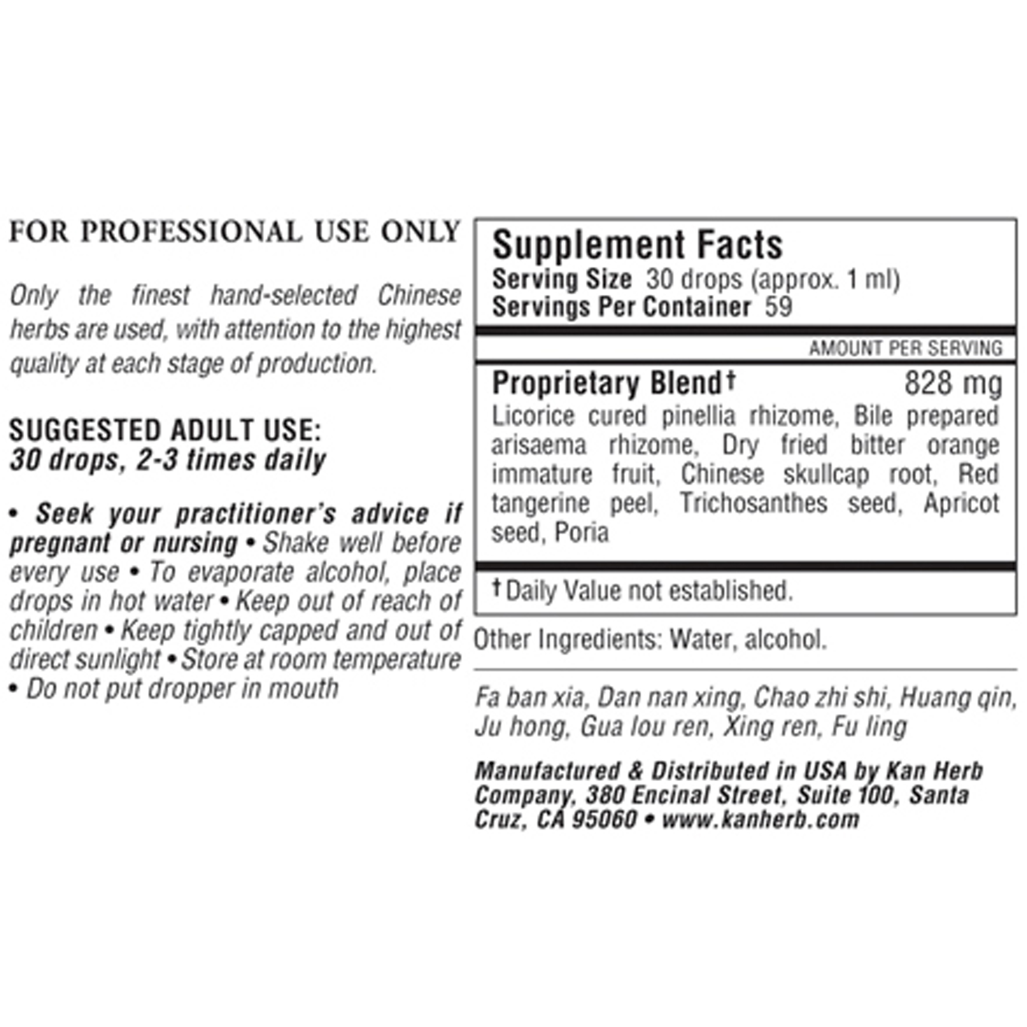 Licorice cured pinellia rhizome, Bile prepared arisaema rhizome, Dry fried bitter orange immature fruit, Chinese skullcap root, Red tangerine peel, Trichosanthes seed, Apricot seed, Poria