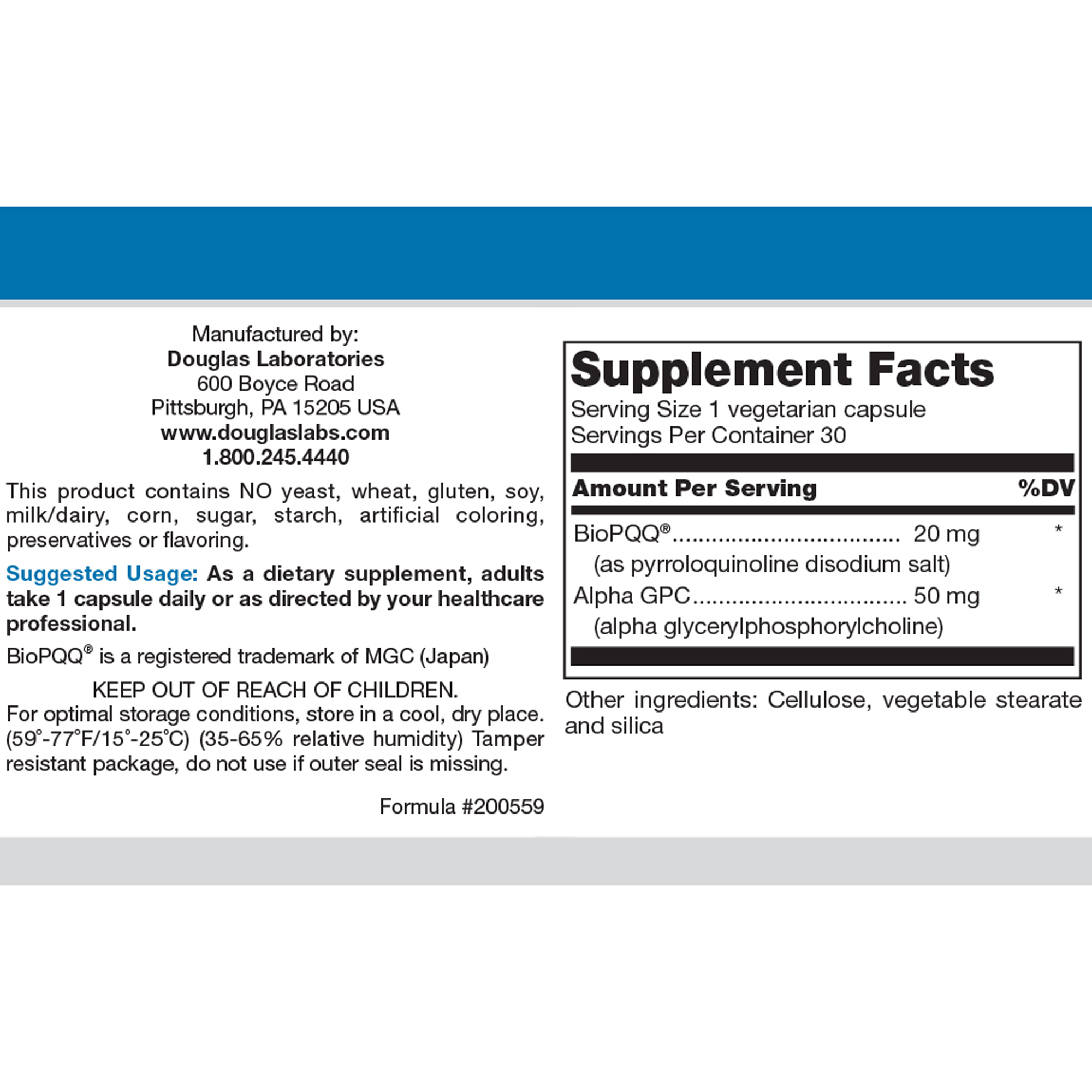 PQQ Plus supplies 20 mg pyrroloquinoline quinone (PQQ), the novel compound that some consider to be a newly discovered vitamin, and 50 mg of alpha glycerylphosphoryl choline (alpha GPC) in each vegetarian capsule for neurological health.†