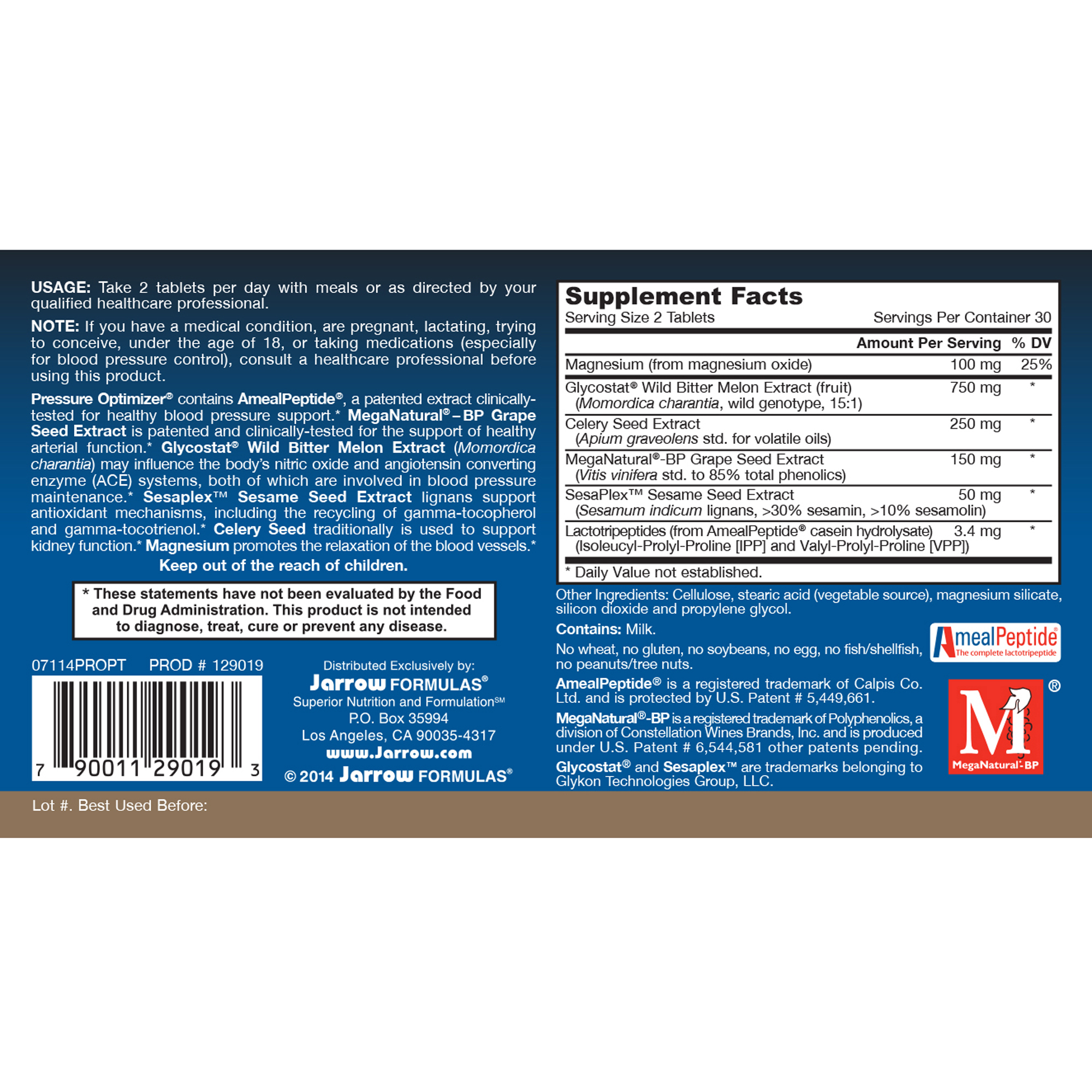 Pressure Optimizer® contains AmealPeptide®, a patented extract clinically-tested for healthy blood pressure support.* MegaNatural®—BP Grape Seed Extract is patented and clinically-tested for the support of healthy arterial function.* Glycostat® Wild Bitter Melon Extract (Momordica charantia) may influence the body’s nitric oxide and angiotensin converting enzyme (ACE) systems, both of which are involved in blood pressure maintenance.* Sesaplex™ Sesame Seed Extract lignans support antioxidant mechanisms, including the recycling of gamma-tocopherol and gamma-tocotrienol.* Celery Seed traditionally is used to support kidney function.* Magnesium promotes the relaxation of the blood vessels.*