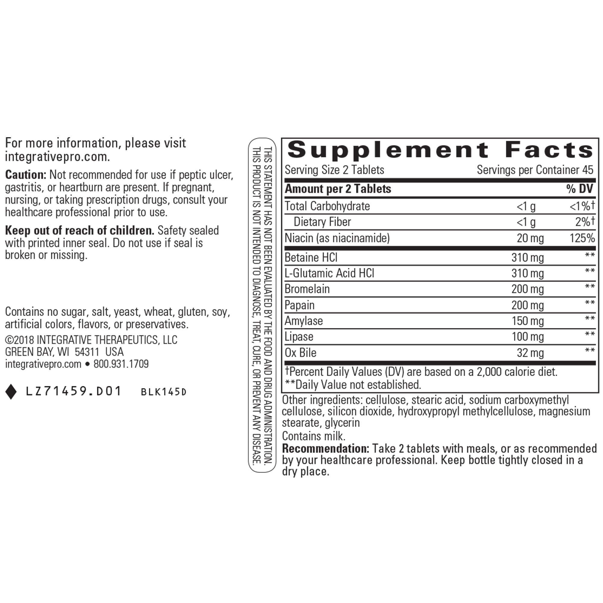 Pro-Gest™contains enzymes and nutrients to support optimal protein digestion.* It contains 310 mg of Betaine HCl per two tablets. Pro-Gest is an appropriate supplement for patients on high protein diets or are increasing their protein intake. It can be taken as needed or routinely. In addition to its support of protein digestion, Pro-Gest contains amylase, lipase, and other enzymes to support digestion of carbohydrates and fats.*