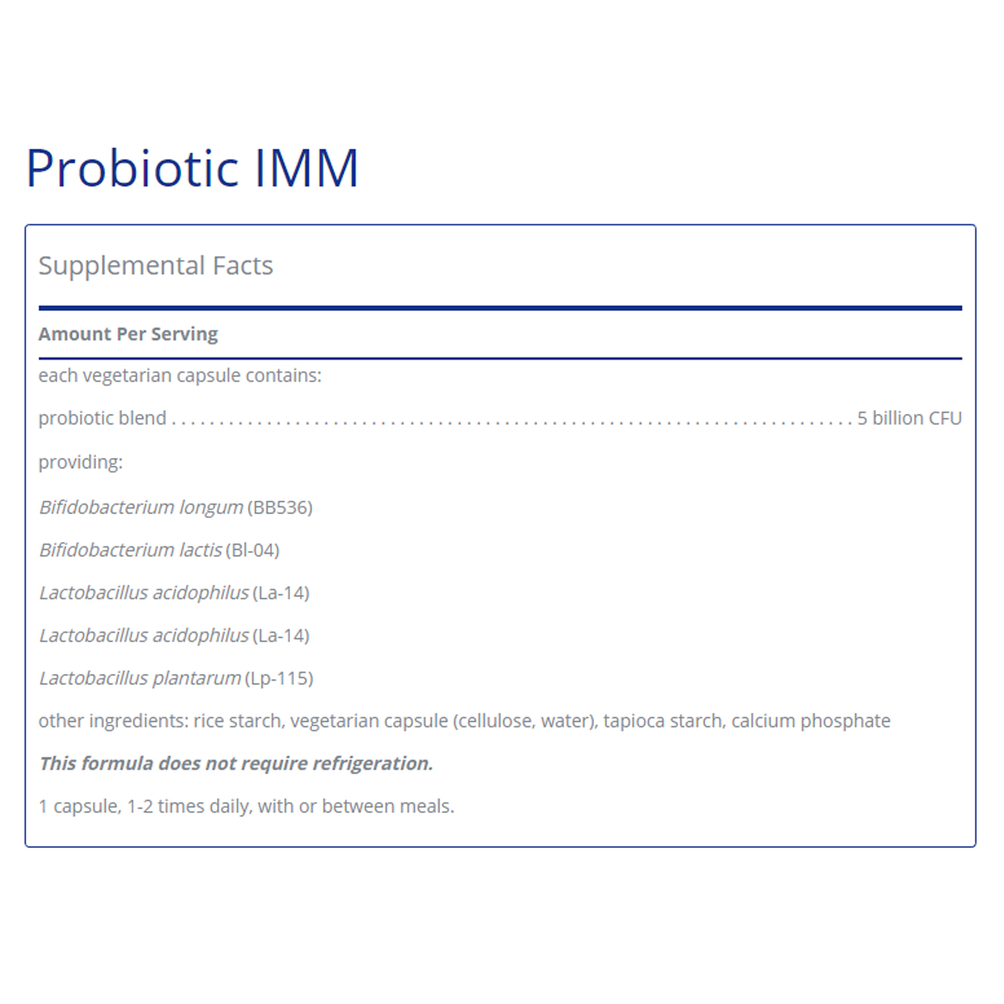A recent meta-analysis involving 9 randomized controlled trials has revealed that probiotics maintain healthy immune and nasal function. Probiotic IMM provides 5 billion CFU per serving of the beneficial bacteria Bifidobacterium longum BB536, Bifidobacterium lactis, Lactobacillus acidophilus, Lactobacillus casei and Lactobacillus plantarum. These strains provide particular support for a healthy immune response and immunoglobulin function. B. longum BB536 is a shelf stable, top-selling probiotic in Japan, supported in the literature by over 25 human trials and 30 animal studies. Double blind, placebo-controlled trials indicate that B. longum BB536 supplementation maintains GI bacteria balance, supporting immune function and maintaining eye, nose and throat health. In another randomized double blind, placebo-controlled trial, L. acidophilus and B. lactis showed support for nasal function and maintained healthy eosinophil activity within the nasal lining. Research involving B. bifidum, L. casei and L. plantarum also suggests that these strains maintain healthy cytokine production, IgE function and mast cell integrity.