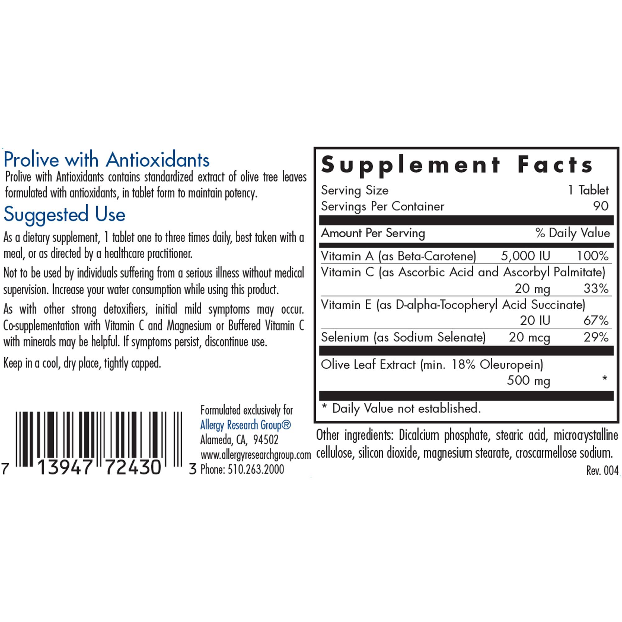Prolive with Antioxidants contains standardized extract of olive tree leaves (Olea europa) formulated with antioxidants, in tablet form to maintain potency. Olive leaf possesses a variety of properties which potentially support balanced intestinal microbiology, circulation and healthy cholesterol within normal levels.