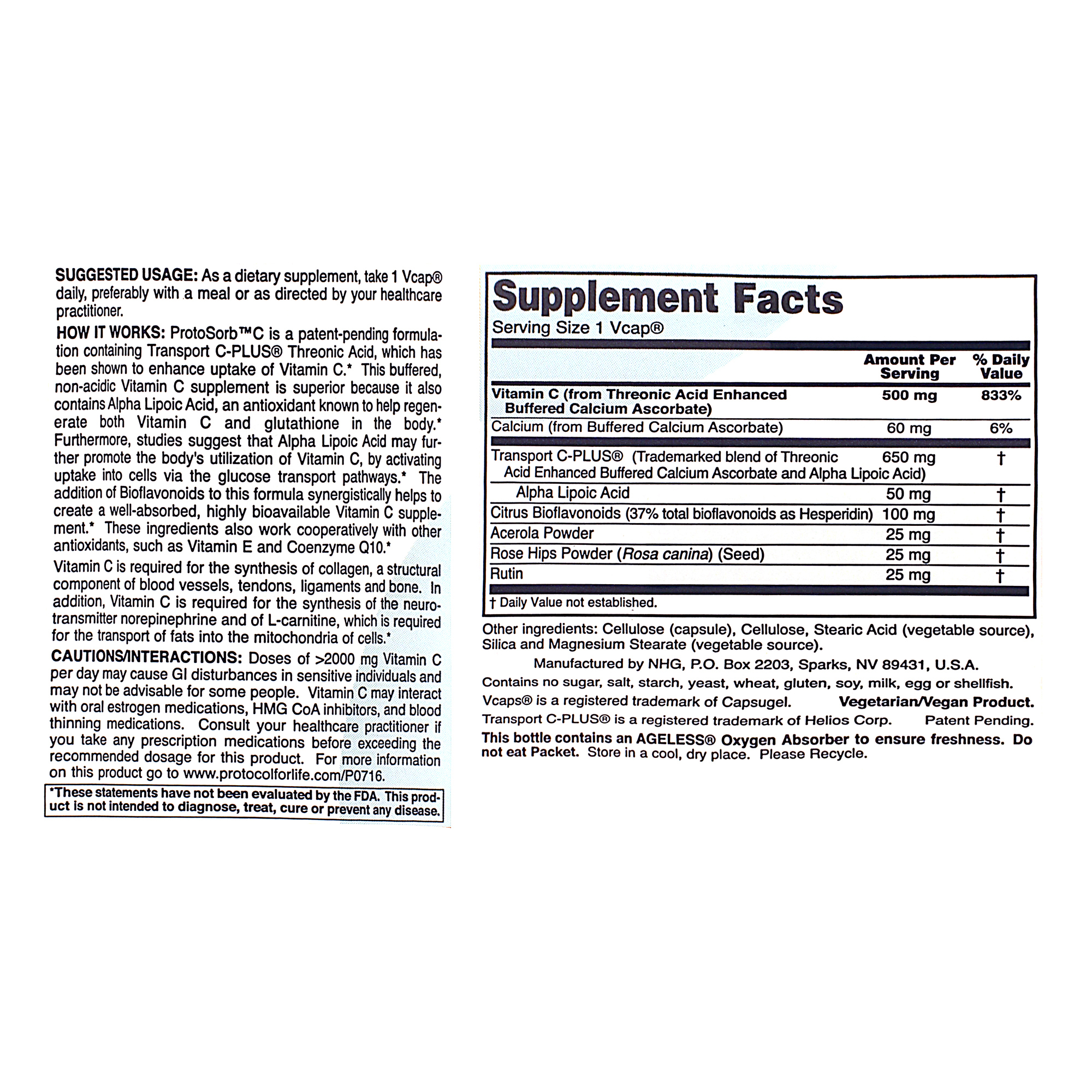 ProtoSorb™ C is a trademarked formulation containing Transport C-PLUS® Threonic Acid, which has been shown to enhance uptake of Vitamin C.* This buffered, non-acidic Vitamin C supplement is superior because it also contains Alpha Lipoic Acid, an antioxidant known to help regenerate both Vitamin C and glutathione in the body.* Furthermore, studies suggest that Alpha Lipoic Acid may further promote the bodys utilization of Vitamin C, by activating uptake into cells via the glucose transport pathways.* The addition of Bioflavonoids to this formula synergistically helps to create a well-absorbed, highly bioavailable Vitamin C supplement.* These ingredients also work cooperatively with other antioxidants, such as Vitamin E and Coenzyme Q10.*