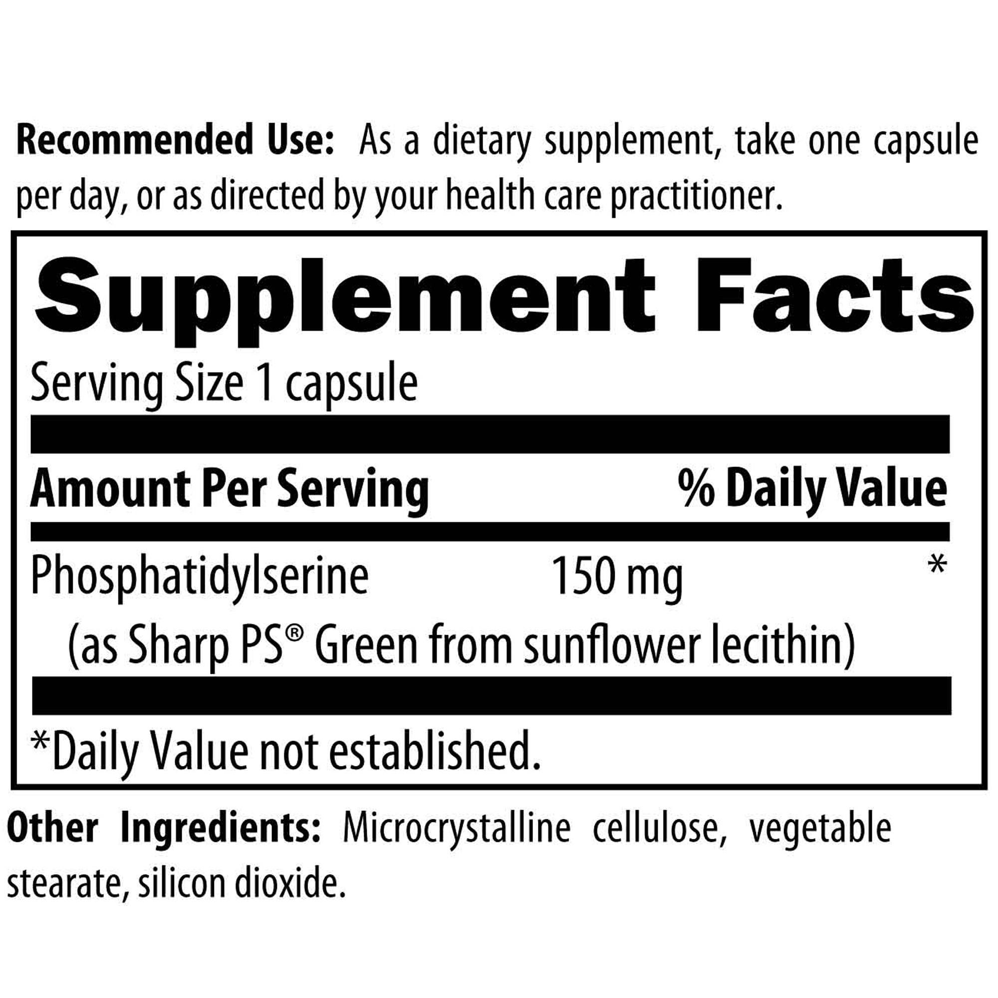 PS 150 features 150 mg of non-soy, sunflower-sourced phosphatidylserine (PS) per capsule. There are no foods rich in PS, so supplementation is essential in order to increase the bodys levels of this brain-supportive nutrient.