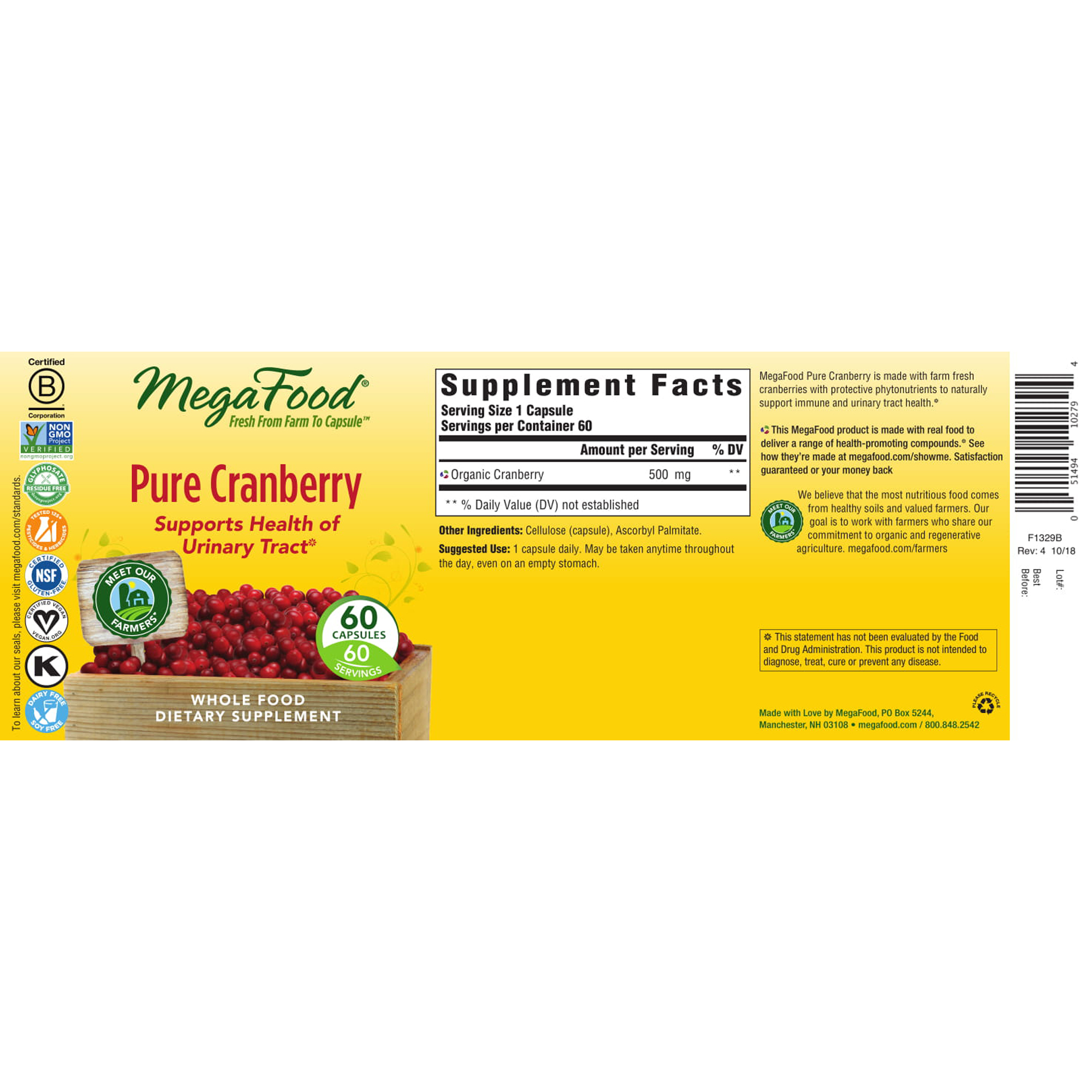 As close to the bog as it gets! MegaFood® Pure Cranberry naturally supports immune and urinary tract health.* It uses farm-fresh cranberries that are carefully milled and dried using our Slo-Food Process™ to deliver the authentic nourishment of freshly-harvested cranberries in each 500 mg capsule.* It can be taken any time of day even on an empty stomach.