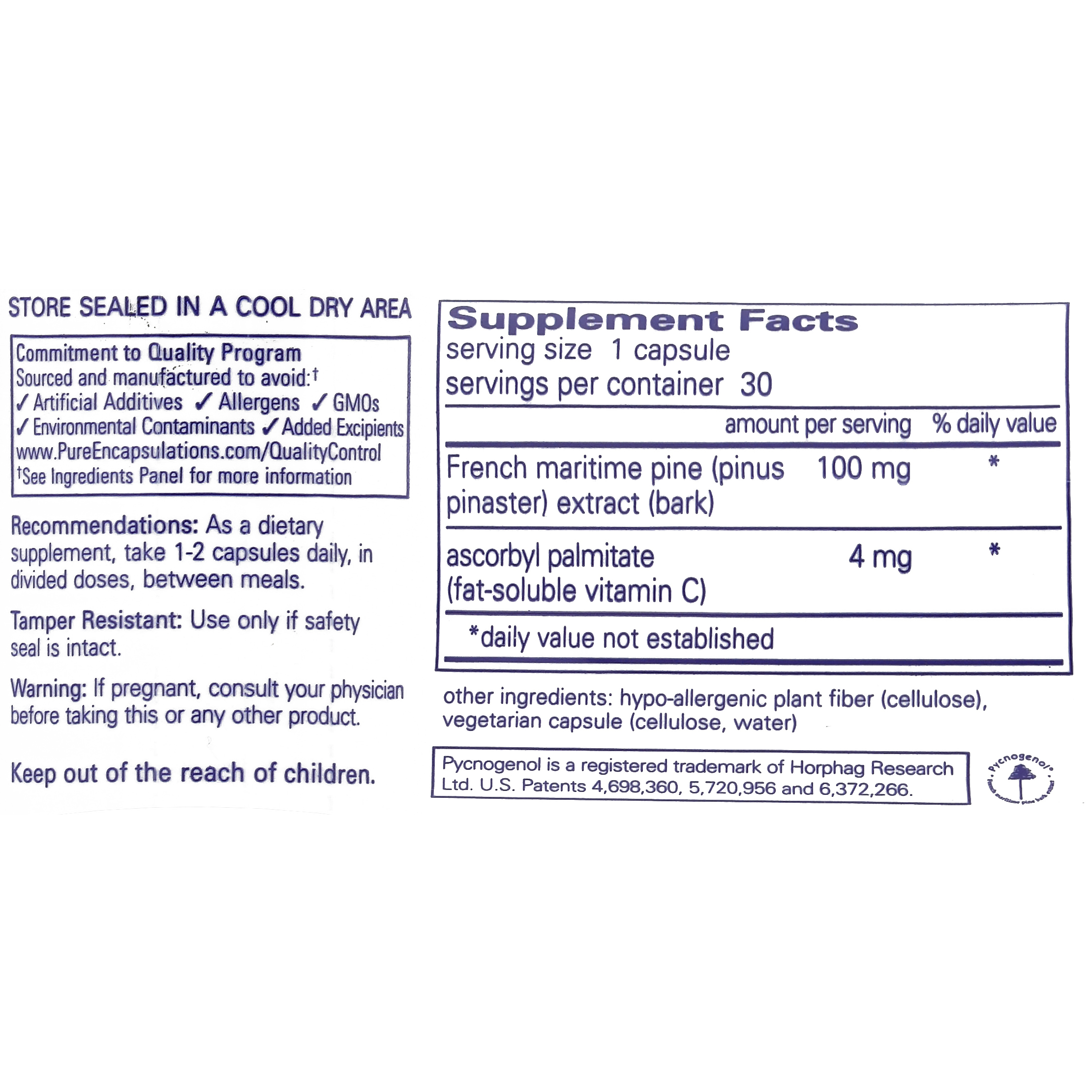 “Pycnogenol” originally denoted all proanthocyanidin extracts, regardless of source. However, it now refers specifically to maritime pine bark. The mixture of proanthocyanidins in pine bark supports vascular endothelial integrity by stabilizing collagenous membranes. They also promote vascular function by modulating nitric oxide levels. In addition to facilitating vitamin C regeneration and preserving vitamin E, pycnogenol is a hydroxyl and superoxide radical scavenger. Collectively, these actions promote the health of blood vessels. Pycnogenol® contains a minimum of 65-75% proanthocyanidins by weight.*