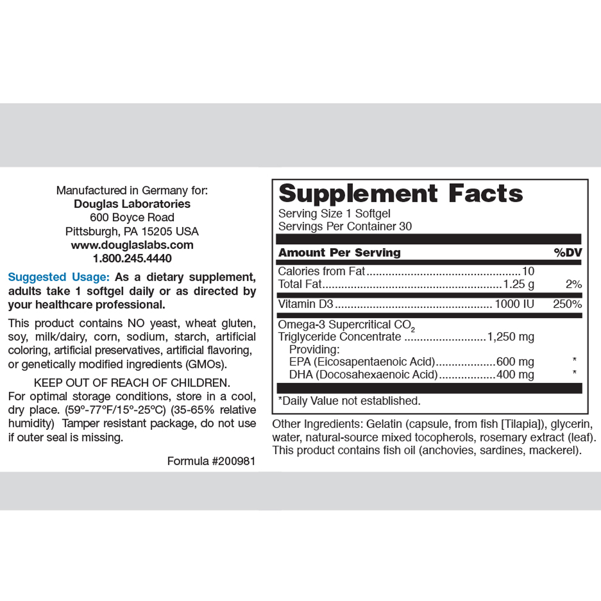 QÜELL Fish Oil® is Supercritical CO2 extracted oils in triglyceride form, manufactured in Germany exclusively for Douglas Laboratories®. QÜELL Fish Oil is unique among other fish oils for its supercritical extraction, purity, bioavailability and concentrations. It is offered in fish gelatin softgels, and the taste and smell of fish is significantly reduced due to the supercritical extraction. EPA/DHA plus D contains a 3:2 ration of EPA to DHA plus 1, 000 IU of vitamin D3 per one softgel.