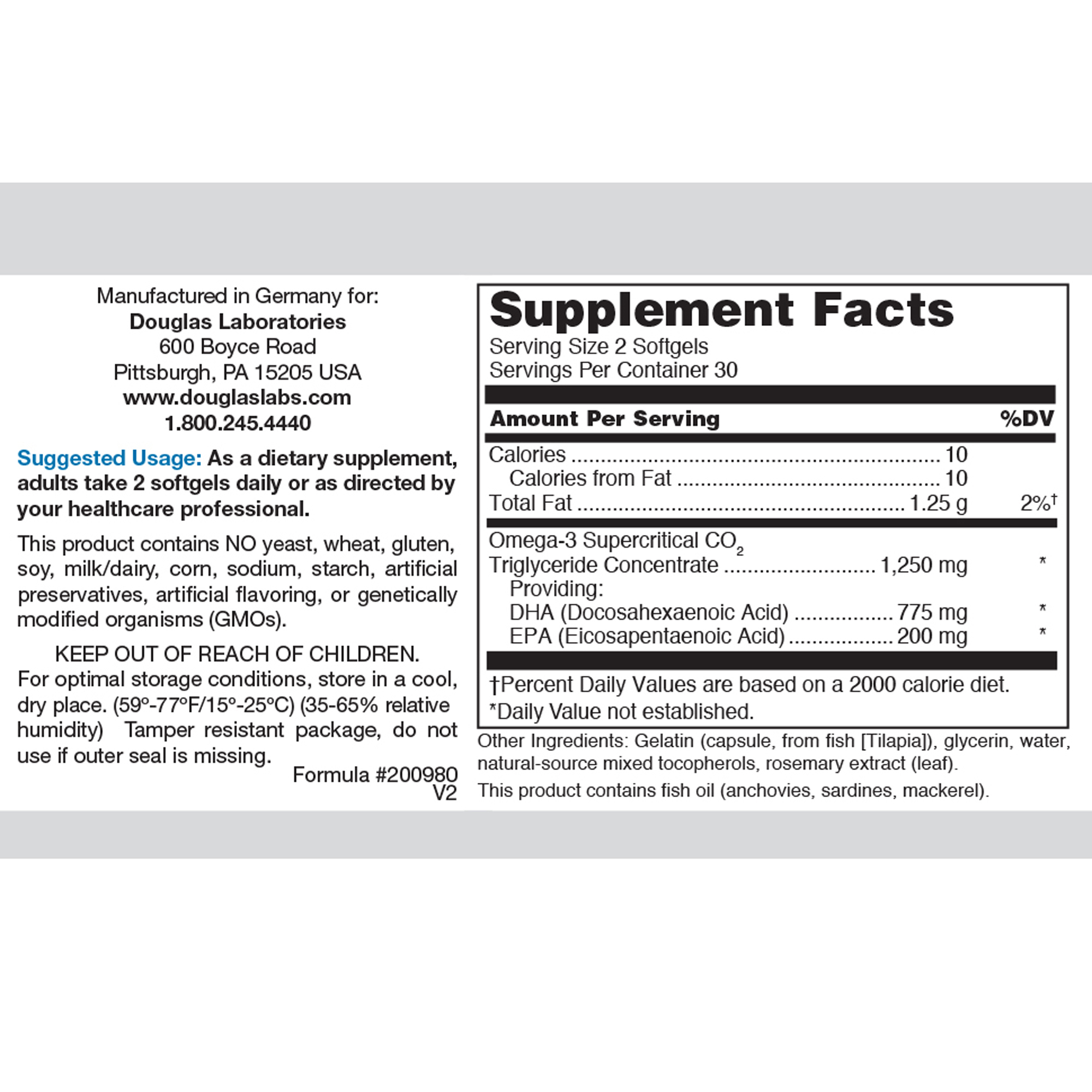 QUELL Fish Oil® is Supercritical CO2 extracted oils in triglyceride form, manufactured in Germany exclusively for Douglas Laboratories®. QUELL Fish Oil is unique among other fish oils for its supercritical extraction, purity, bioavailability and concentrations. It is offered in fish gelatin softgels, and the taste and smell of fish is significantly reduced due to the supercritical extraction. Ultra DHA contains a significantly higher ratio of DHA to EPA that is indicated for cognitive or maternal health.†