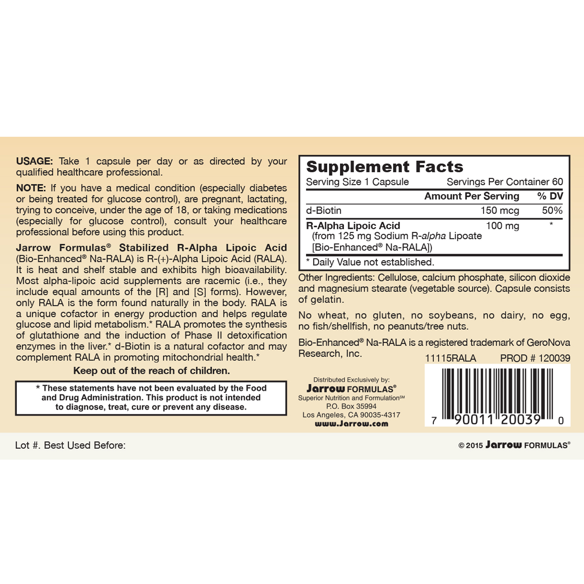 Jarrow Formulas® Stabilized R-Alpha Lipoic Acid (Bio-Enhanced® Na-RALA) is R-(+)-Alpha Lipoic Acid (RALA). It is heat and shelf stable and exhibits high bioavailability. Most alpha-lipoic acid supplements are racemic (i.e., they include equal amounts of the [(R)] and [(S)] forms). However, only RALA is the form found naturally in the body. RALA is a unique cofactor in energy production and helps regulate glucose and lipid metabolism.* RALA promotes the synthesis of glutathione and the induction of Phase II detoxification enzymes.* d-Biotin is a natural cofactor and