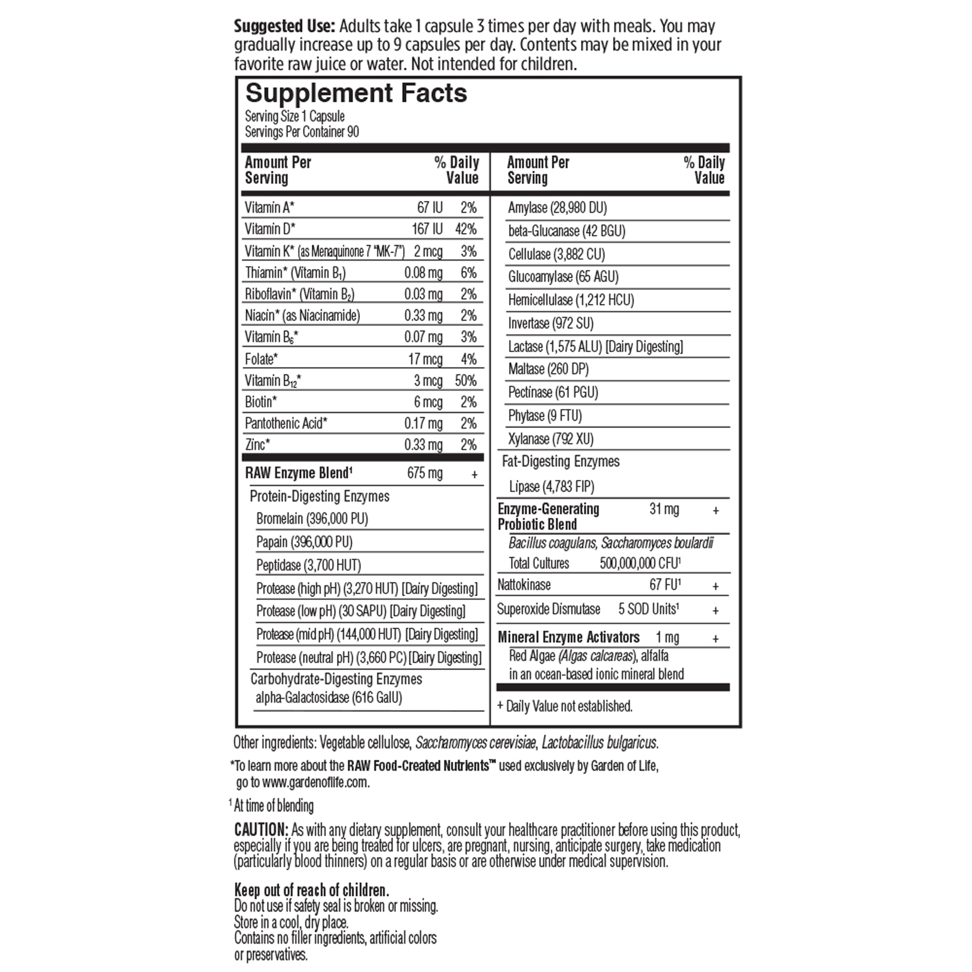 Garden of Life introduces RAW Enzymes—the most powerful digestive enzyme formulas available. RAW Enzymes—whole food, plant-based enzyme formulas that deliver 22 powerful digestive enzymes with unsurpassed enzymatic activity to help your body digest the complete range of proteins, fats, carbohydrates and fiber. Enzymes can aid in the digestion of dairy, grains, sugars, nuts, seeds, beans, broccoli and cabbage as well as other difficult-to-digest foods. RAW Enzymes supports the digestion of fruit, vegetable and grain nutrients while reducing the occasional discomfort sometimes experienced from these foods.