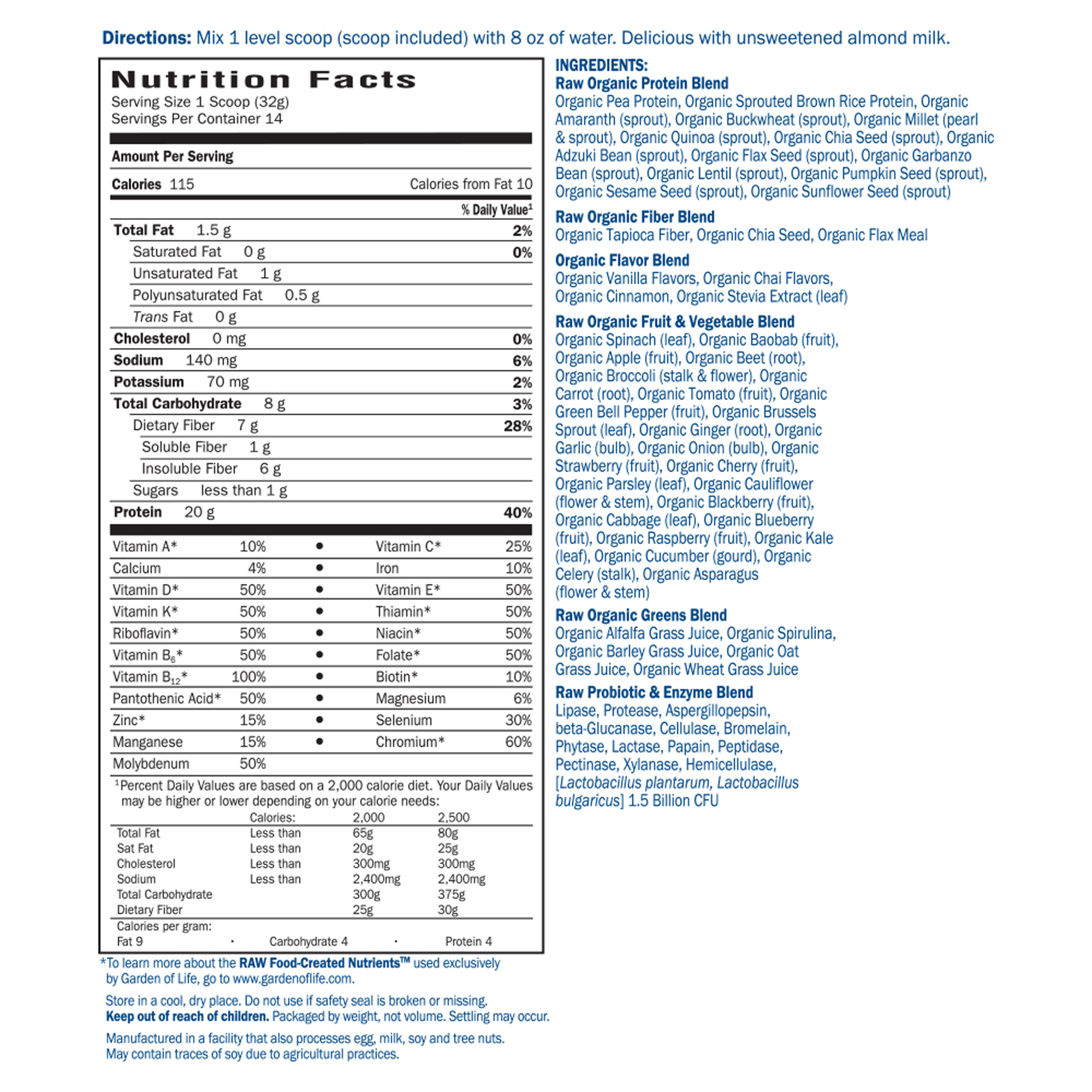 -Contains 13 RAW organic sprouts, 4 RAW organic cereal grass juices, 5 RAW organic fruits, spirulina and chlorella
