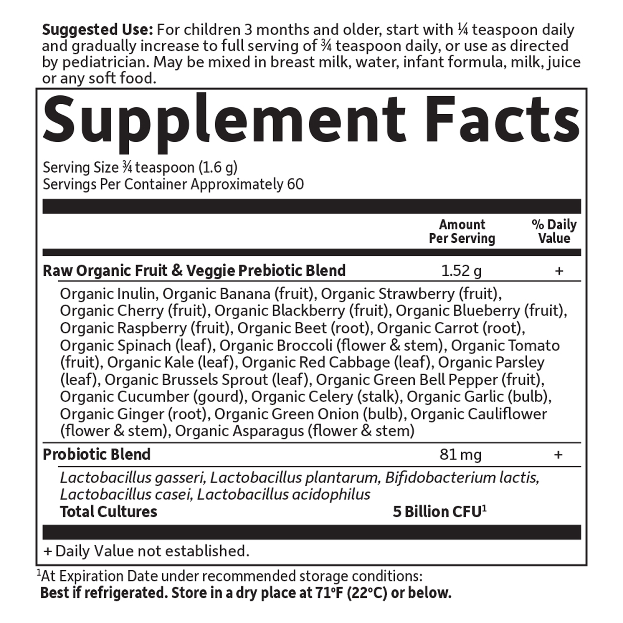 RAW, organic, whole food probiotic formula specifically designed to meet the unique needs of children, RAW Probiotics Kids is formulated with powerful probiotics, 23 RAW and organic fruits and vegetables, plus RAW inulin, a prebiotic that supports probiotic growth. RAW Probiotics Kids delivers over 5 Billion live probiotic cells1 per daily serving.
