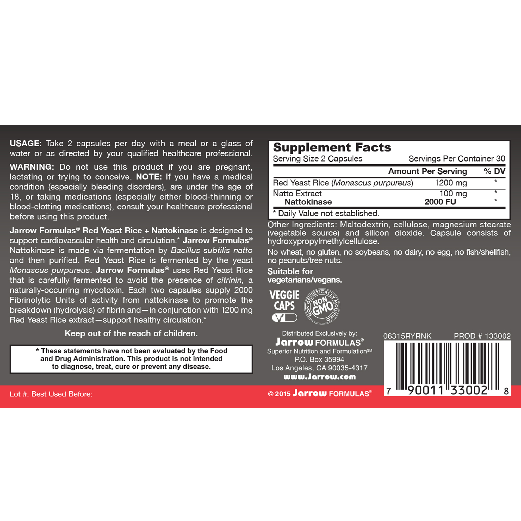 Jarrow Formulas® Red Yeast Rice + Nattokinase is designed to support cardiovascular health and circulation.* Jarrow Formulas® Nattokinase is made via fermentation by Bacillus subtilis natto and then purified. Red Yeast Rice is fermented by the yeast Monascus purpureus. Jarrow Formulas® uses Red Yeast Rice that is carefully fermented and tested for impurities, including citrinin, a naturally-occurring mycotoxin. Each two capsules supply 2000 Fibrinolytic Units of activity from nattokinase to promote the breakdown (hydrolysis) of fibrin and – in conjunction with 1200 mg Red Yeast Rice extract – support healthy circulation.*