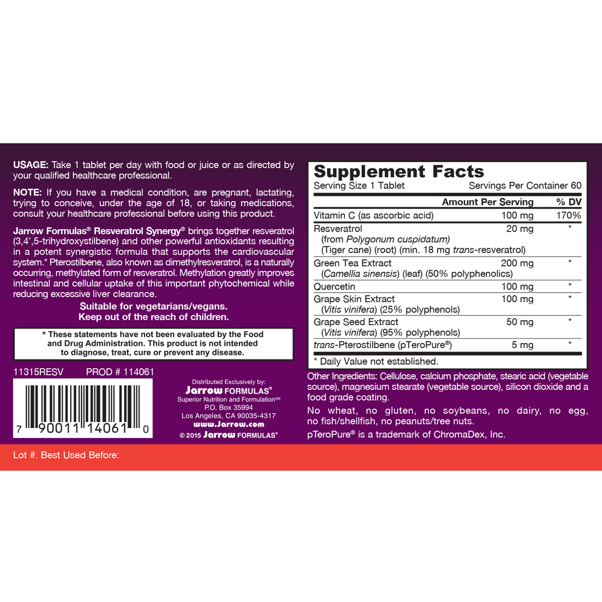 Jarrow Formulas® Resveratrol Synergy® brings together resveratrol (3, 4’, 5-trihydroxystilbene) and other powerful antioxidants resulting in a potent synergistic formula that supports the cardiovascular system.* Pterostilbene, also known as dimethylresveratrol, is a methylated naturally-occurring form of resveratrol. Methylation greatly improves intestinal and cellular uptake of this nutrient while reducing excessive liver clearance.