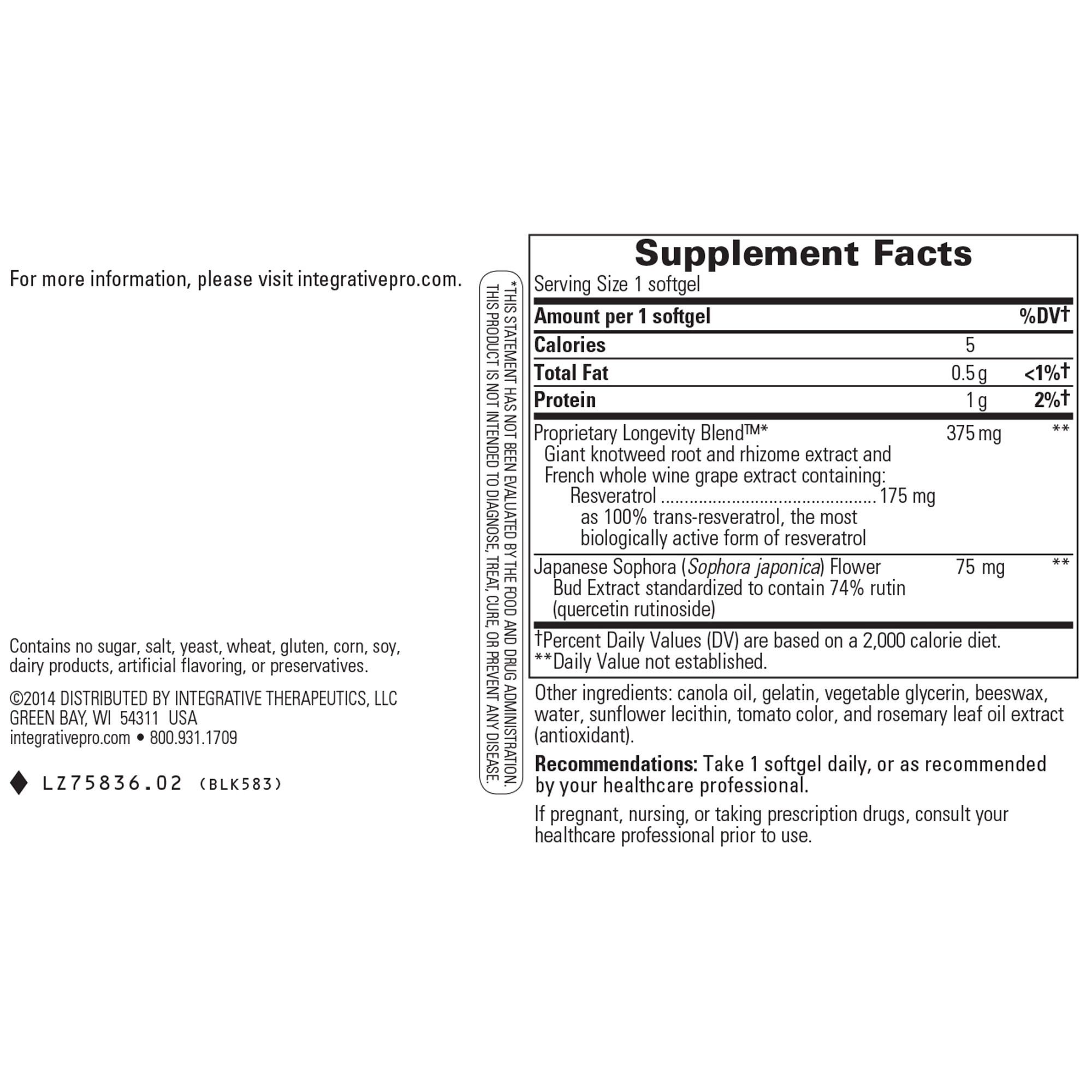 Resveratrol Ultra HP contains trans-resveratrol which supports cardiovascular health.* Resveratrol Ultra HP also contains rutin (quercetin rutinoside), a bioflavonoid from Japanese sophora (Sophora japonica) flower bud, which is converted to quercetin in the body. Research suggests that the combination of quercetin and resveratrol provides support for the immune system than either compound alone.*