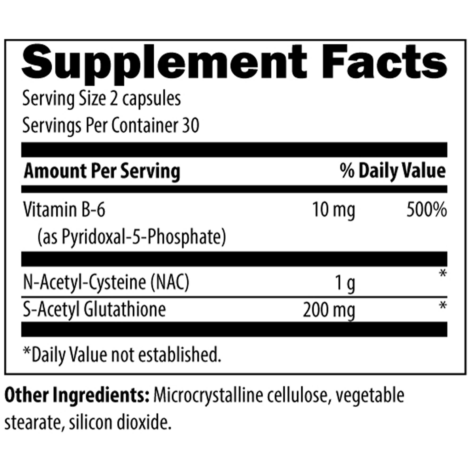 This product also includes N-acetyl-cysteine (NAC) and vitamin B6, both of which are important for the production of glutathione.