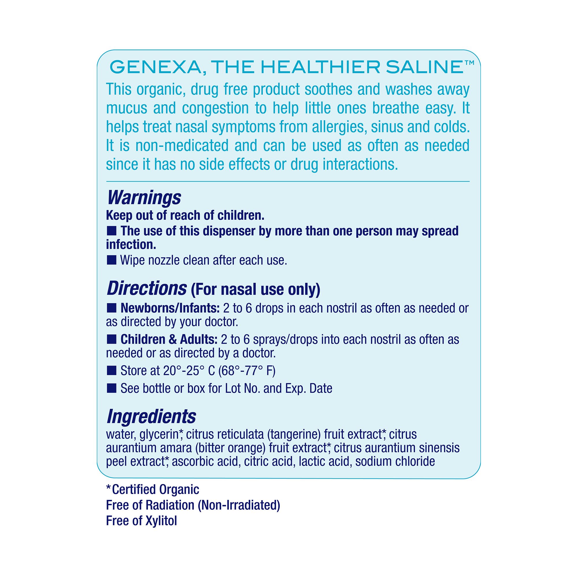 A safe, drug-free nasal spray for infants – Saline Care for Infants™ is a certified organic and non-GMO nasal spray. Clear baby’s nose with a dropper that soothes and washes away mucus, providing soothing relief from sinus symptoms due to allergies and colds. Saline Care helps little noses breathe easy!