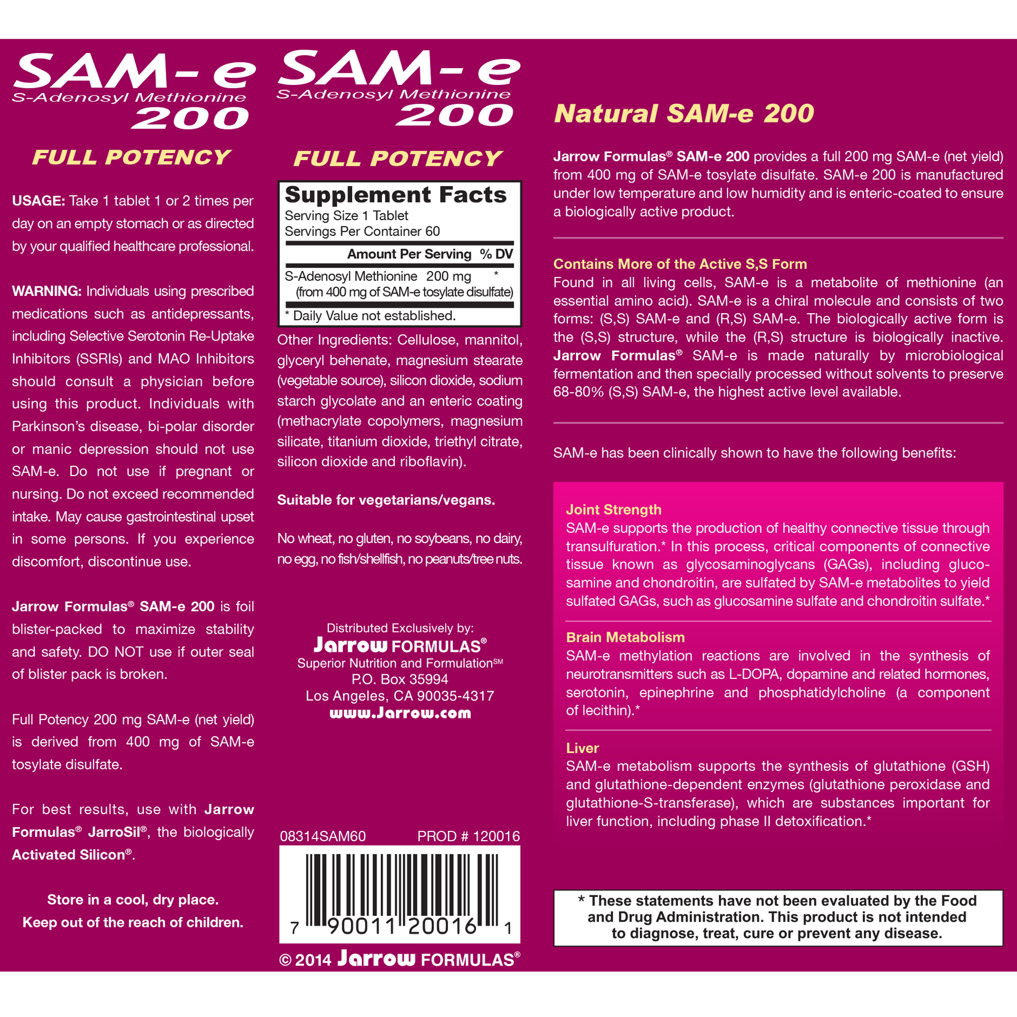 Jarrow Formulas® SAMe 200 provides a full 200 mg SAMe (net yield) from 400 mg of SAMe tosylate disulfate. SAMe 200 is manufactured under low temperature and low humidity and is enteric-coated to ensure a biologically active product.