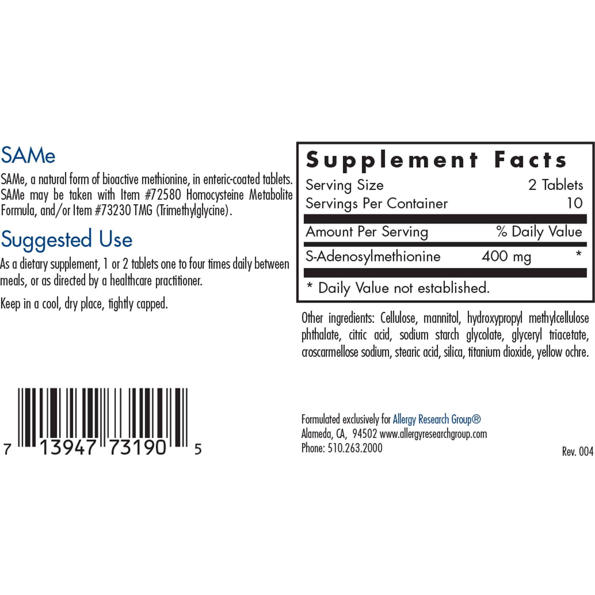For optimal metabolism and utilization, SAMe can be taken with Item #72580 Homocysteine Metabolite Formula, and/or Item #73230 TMG (Trimethylglycine).