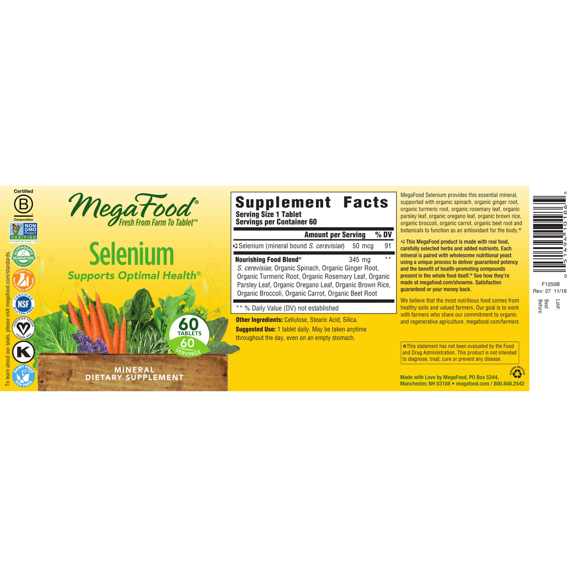 MegaFood® Selenium, an essential mineral, functions as an antioxidant, and is supported with the inclusion of organic spinach, organic ginger root, organic turmeric root, organic rosemary leaf, organic parsley leaf, organic oregano leaf, organic brown rice, organic broccoli, organic carrot, organic beet root and botanicals*