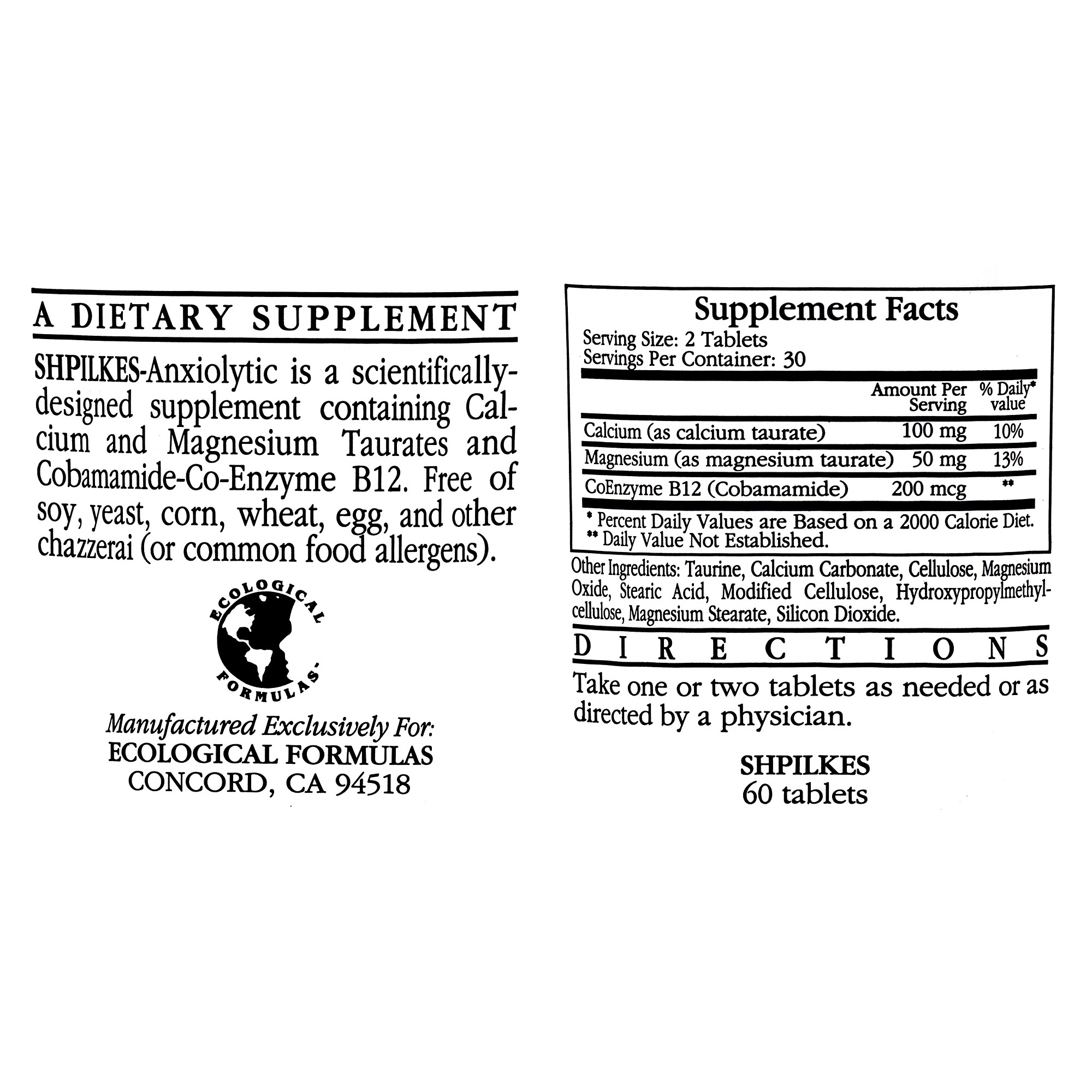 Shpilkes-Anxiolytic is a scientifically designed supplement containing Calcium and Magnesium Taurates and Cobamamide-Co-Enzyme B12.