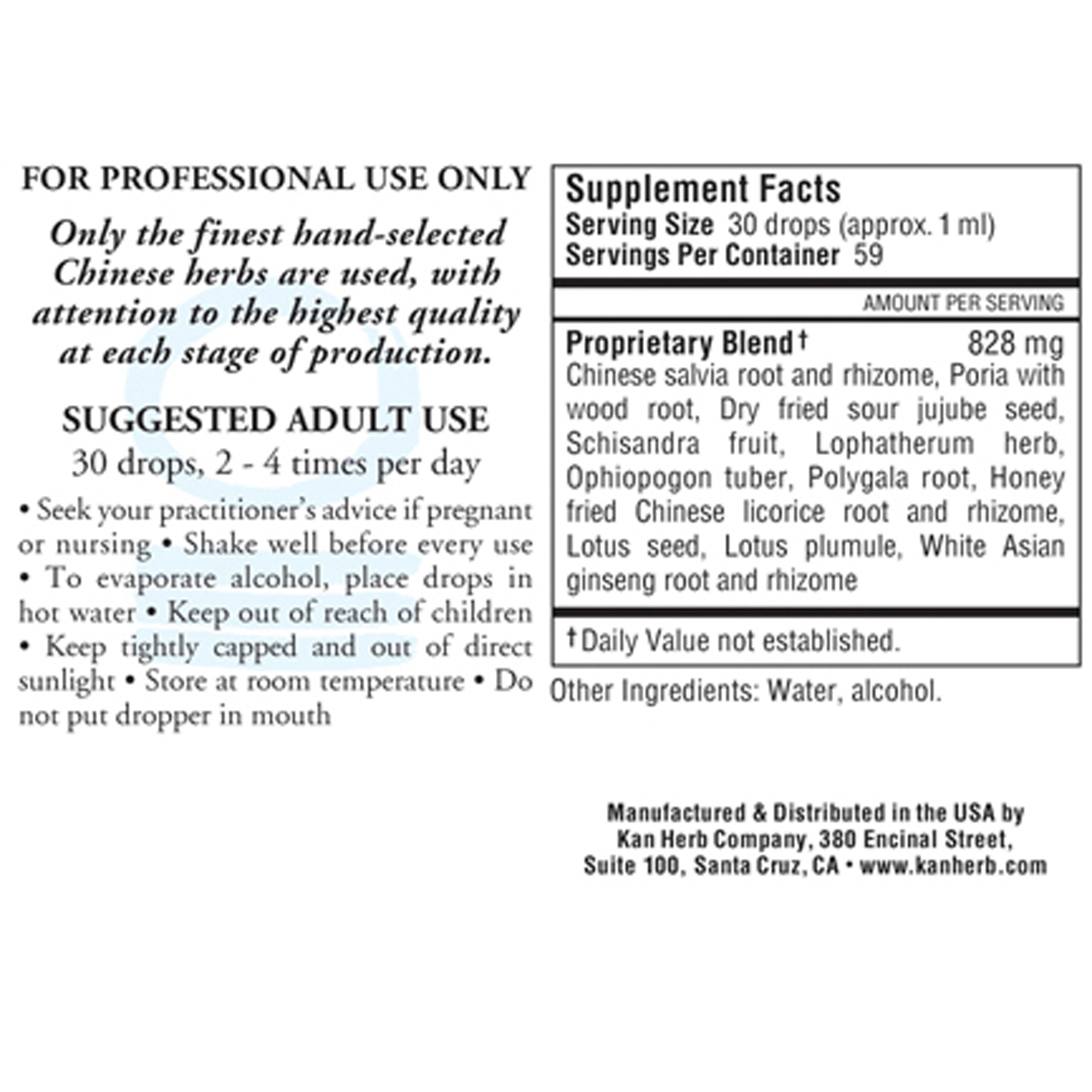 Chinese salvia root & rhizome, Poria with wood root, Sour jujube seed (dry fried), Schisandra fruit, Lophatherum leaf & stem, Ophiopogon tuber, Polygala root, Chinese licorice root (honey-fried), Lotus seed, Lotus plumule, White Asian ginseng root, White Asian ginseng tail.
