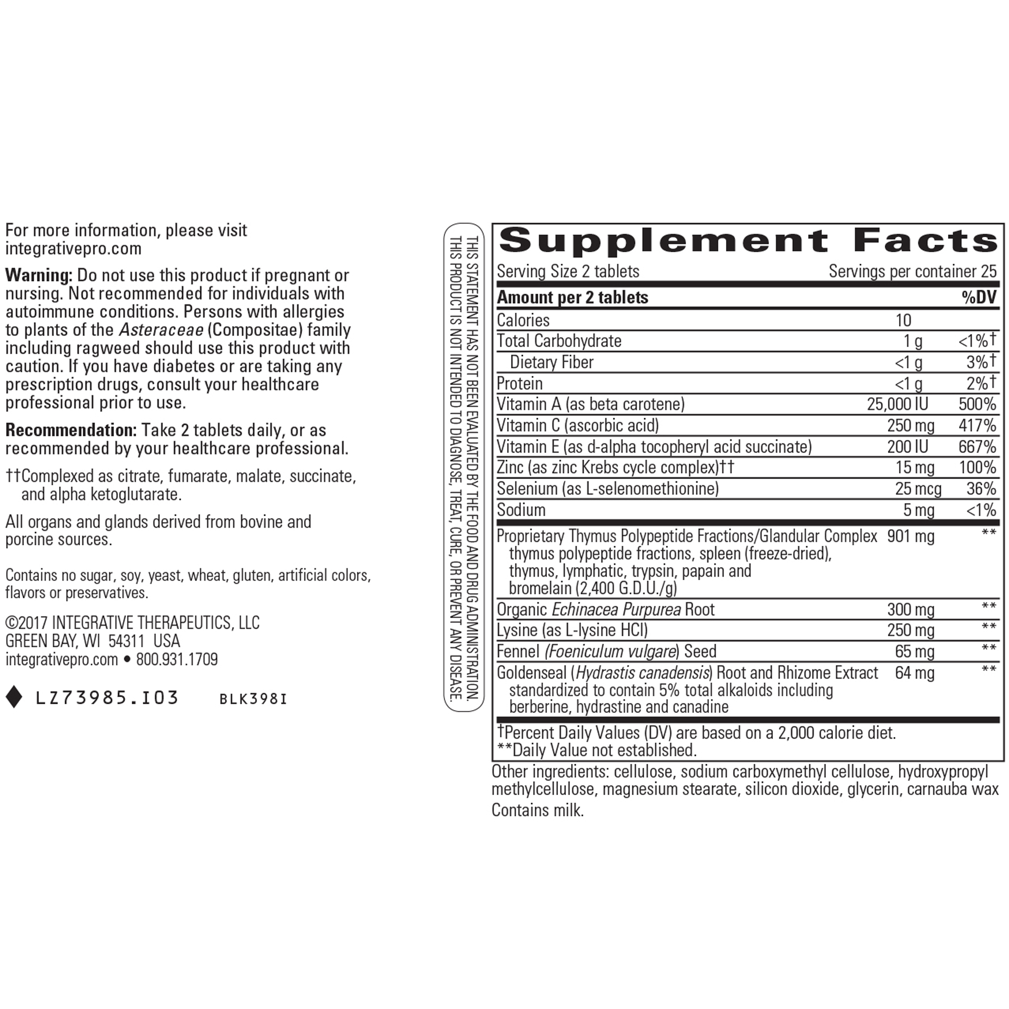 Thymuril® thymus gland support contains an exclusive preparation of Thymus Polypeptide Fractions along with essential vitamins, minerals, lysine, and herbs to provide comprehensive support for the immune system, including white blood cell functions and thymus gland activity.*