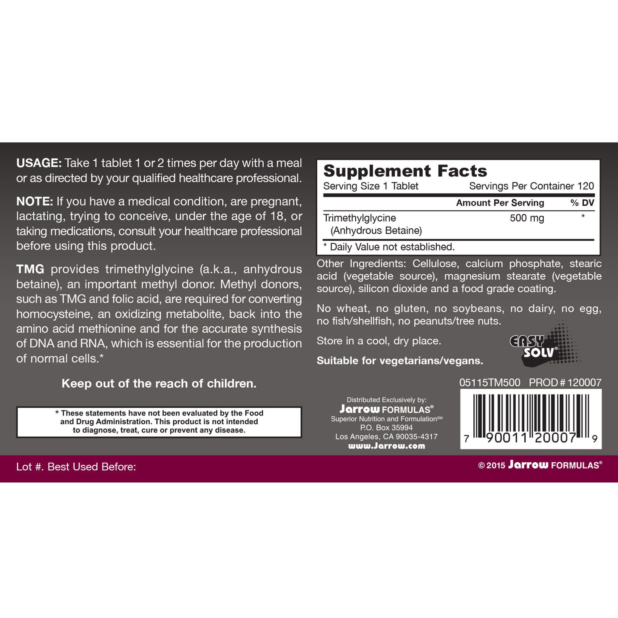TMG provides trimethylglycine (a.k.a., anhydrous betaine), an important methyl donor. Methyl donors, such as TMG and folic acid, are required for converting homocysteine (a potentially-toxic intermediate, posing a serious health risk) back into the essential amino acid L-methionine and for the accurate synthesis of DNA and RNA, which is essential for the production of normal cells.*