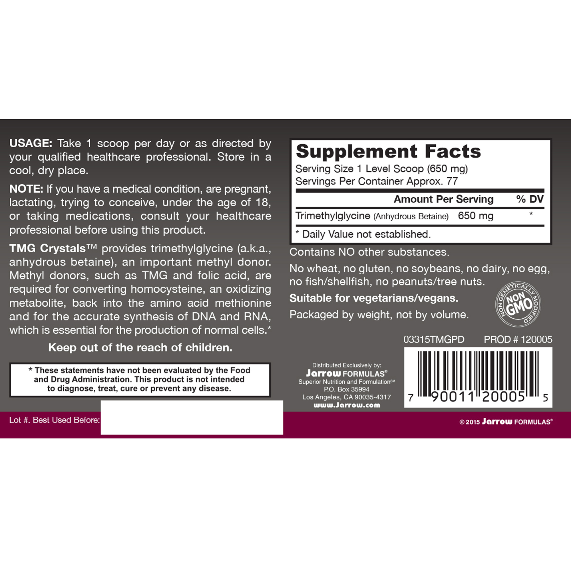 TMG Crystals™ provides trimethylglycine (a.k.a., anhydrous betaine), an important methyl donor. Methyl donors, such as TMG and folic acid, are required for converting homocysteine, a potentially-toxic intermediate, back into methionine and for the accurate synthesis of DNA and RNA, which is essential for the production of normal cells.*