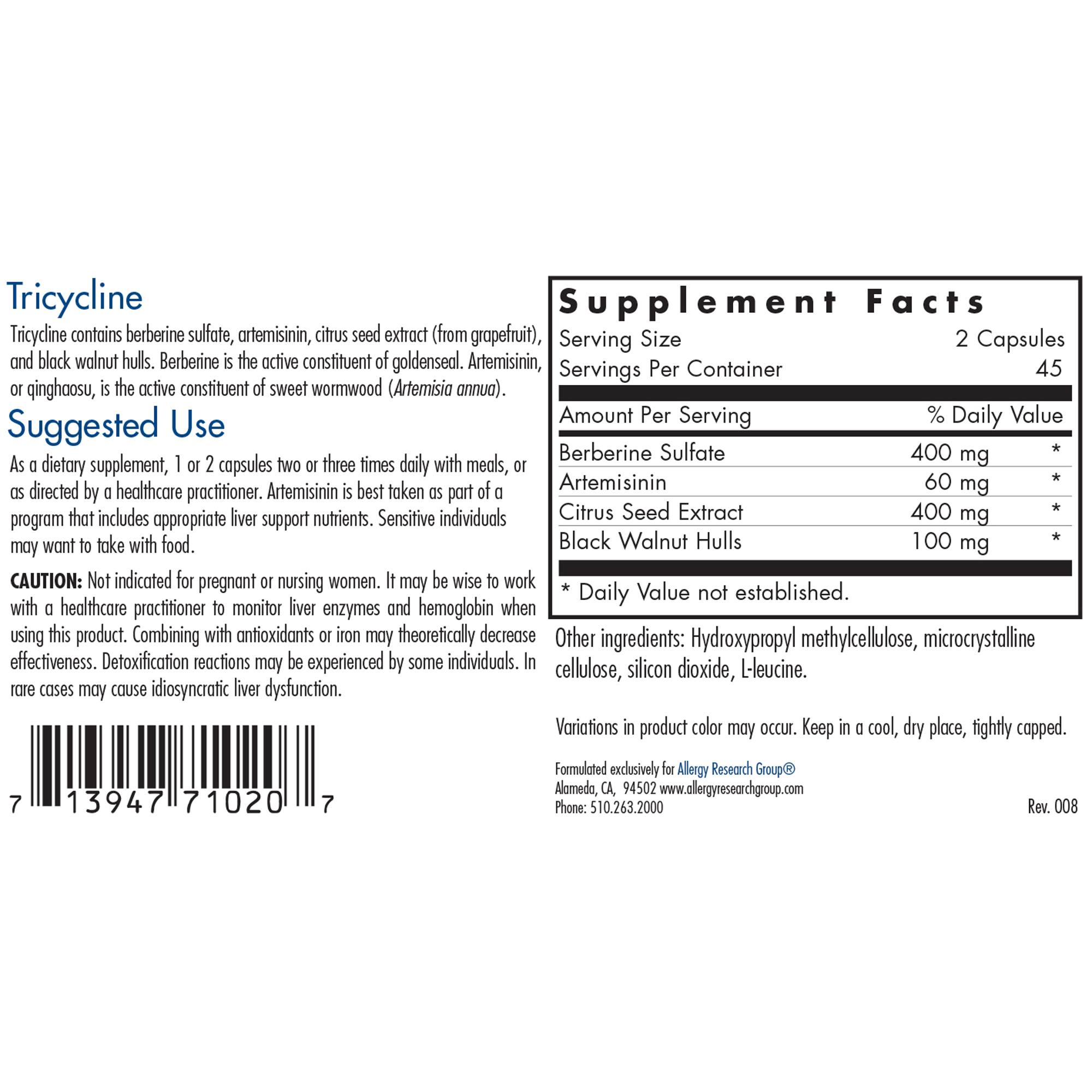 Tricycline contains berberine sulfate, artemisinin, citrus seed extract (from grapefruit), and black walnut hulls. Berberine is the active constituent of goldenseal. Artemisinin, or qinghaosu, is the active constituent of sweet wormwood (Artemisia annua).